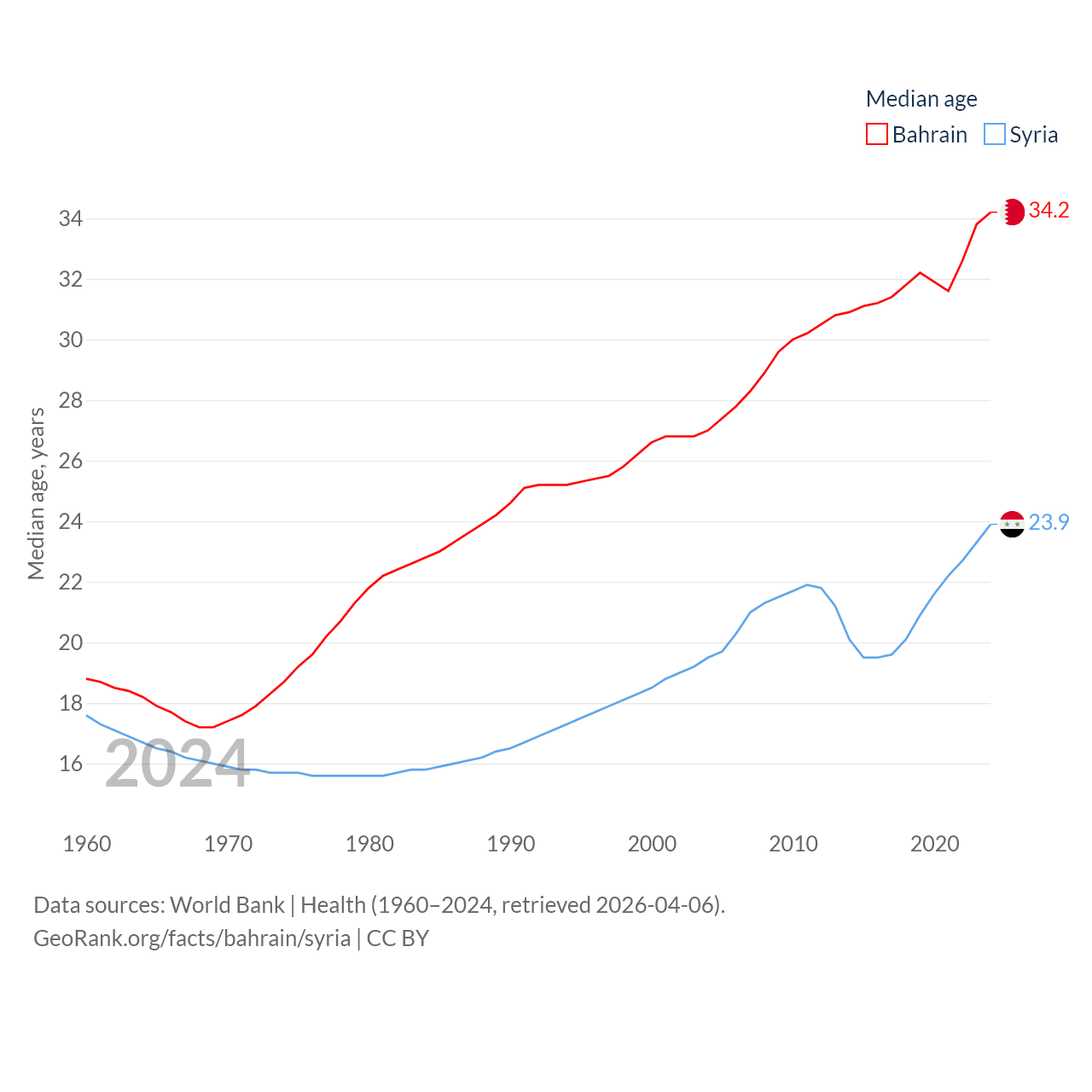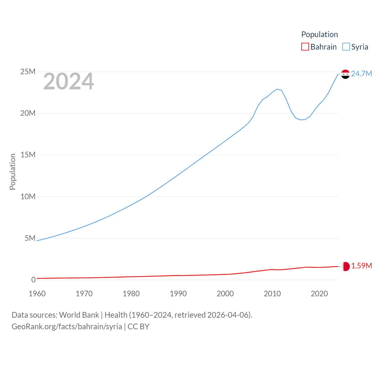 Bahrain has a population of 1.59M (ranked 151/197), compared with 24.7M in Syria (ranked 57/197). Bahrain's land area is 309 sq mi versus 70,900 sq mi for Syria (ranked 174th vs. 87th).