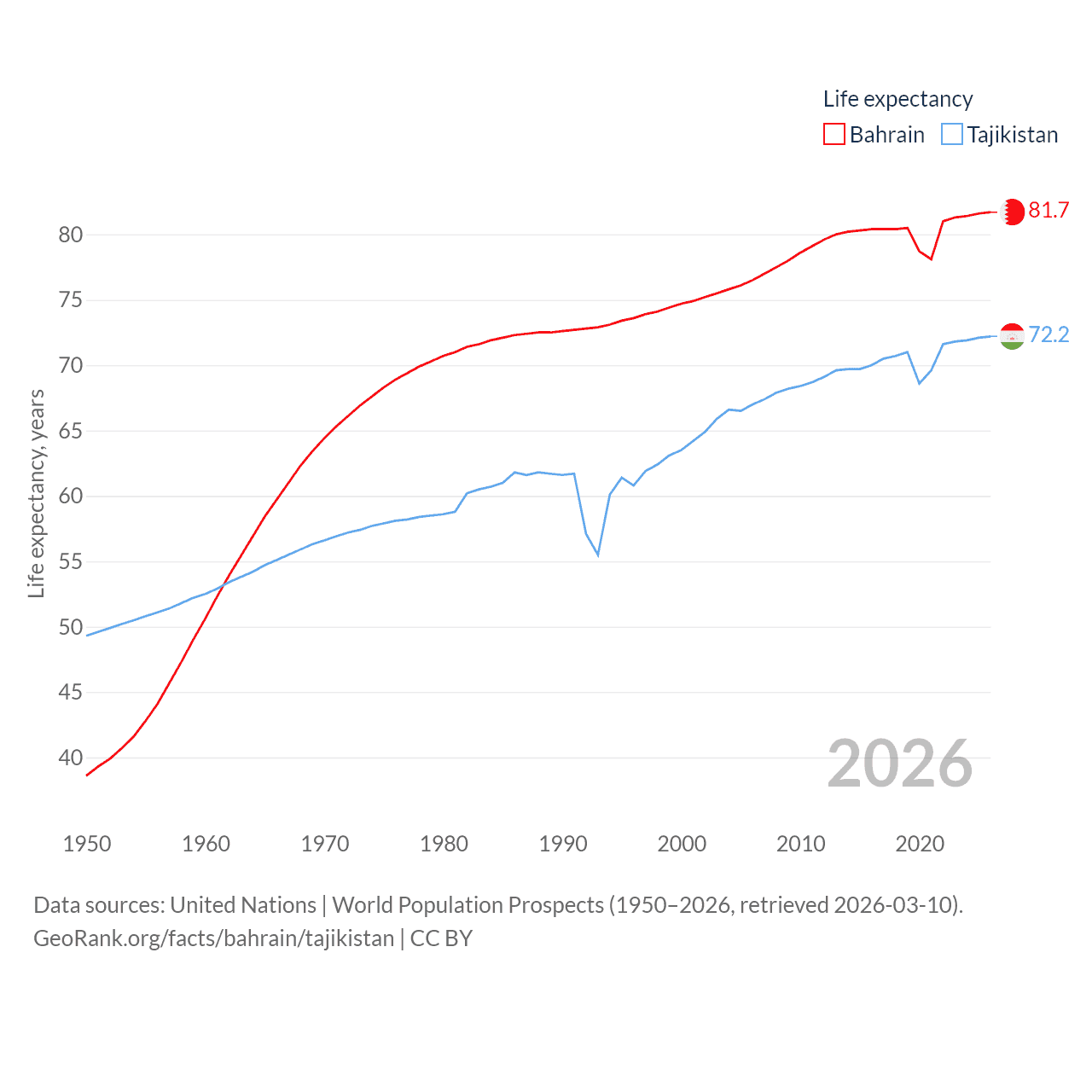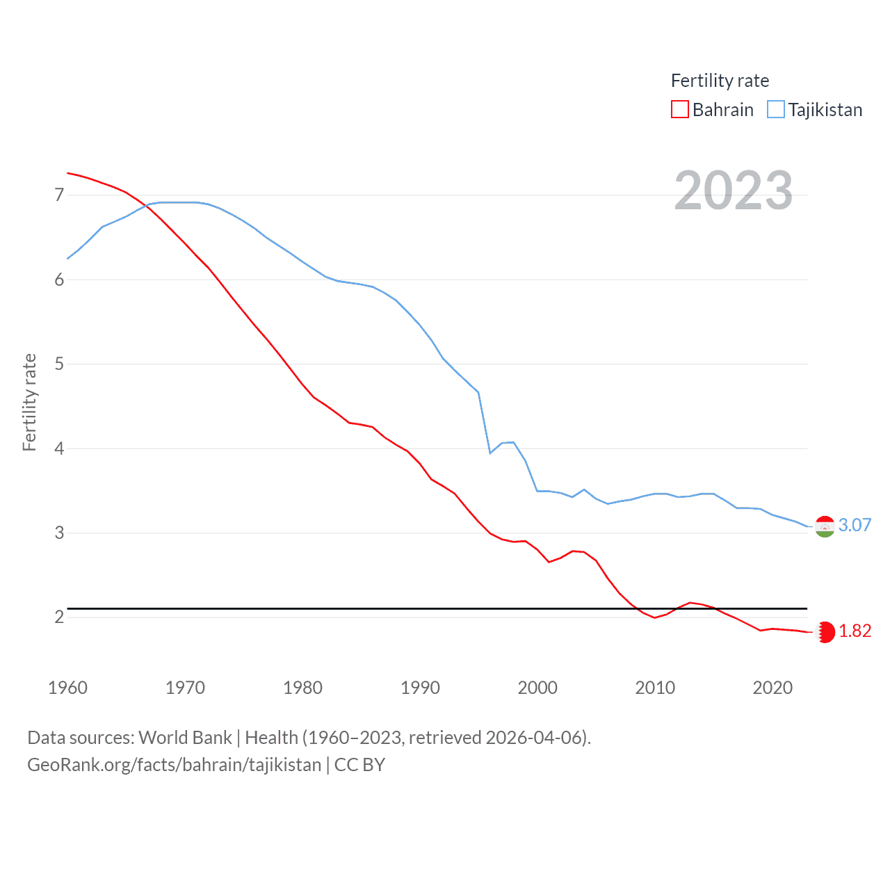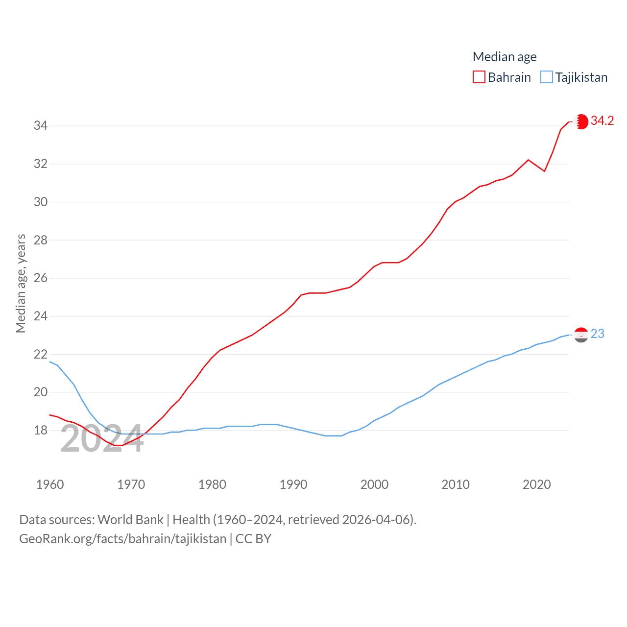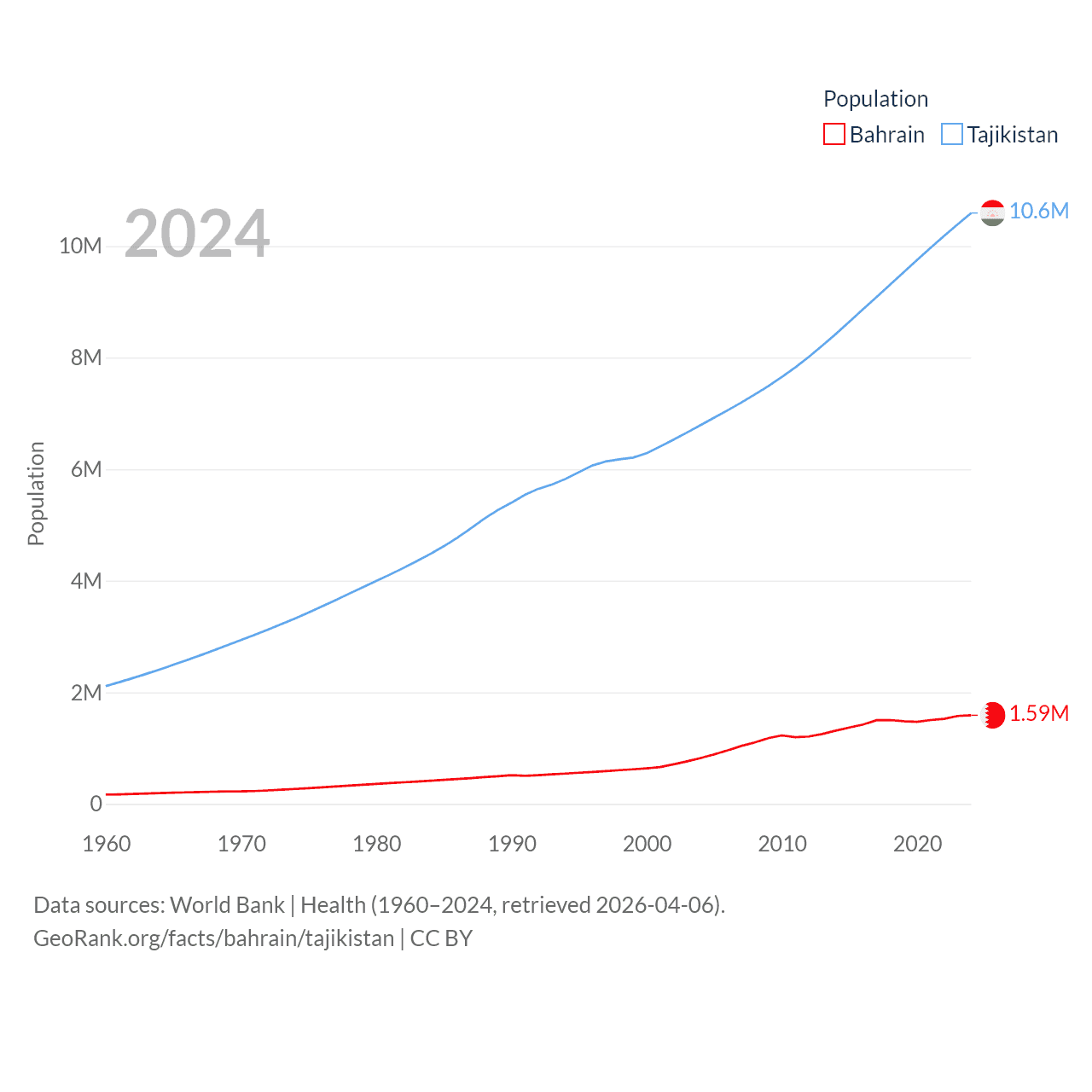 Bahrain has a population of 1.59M (ranked 151/197), compared with 10.6M in Tajikistan (ranked 91/197). Bahrain's land area is 309 sq mi versus 53,587 sq mi for Tajikistan (ranked 174th vs. 93rd).