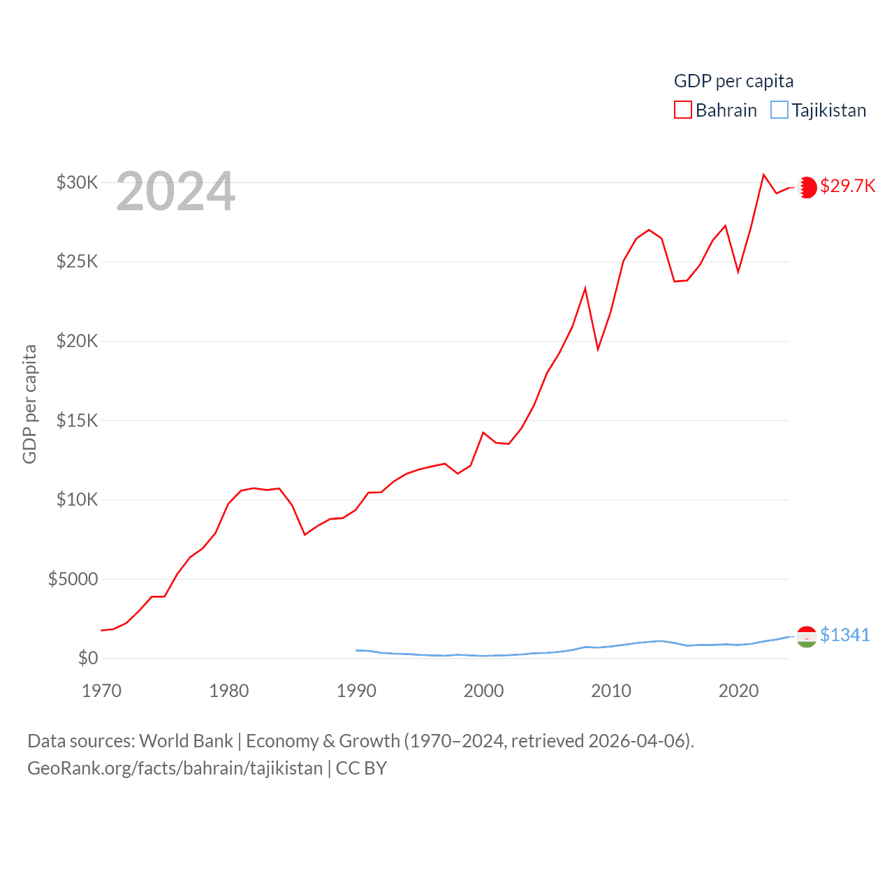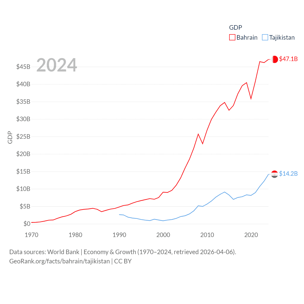 By GDP, Bahrain ranks 96/197 ($47.1B) and Tajikistan ranks 145/197 ($14.2B). By GDP per capita, Bahrain ranks 42/197 ($29,654), while Tajikistan ranks 166/197 ($1,341).