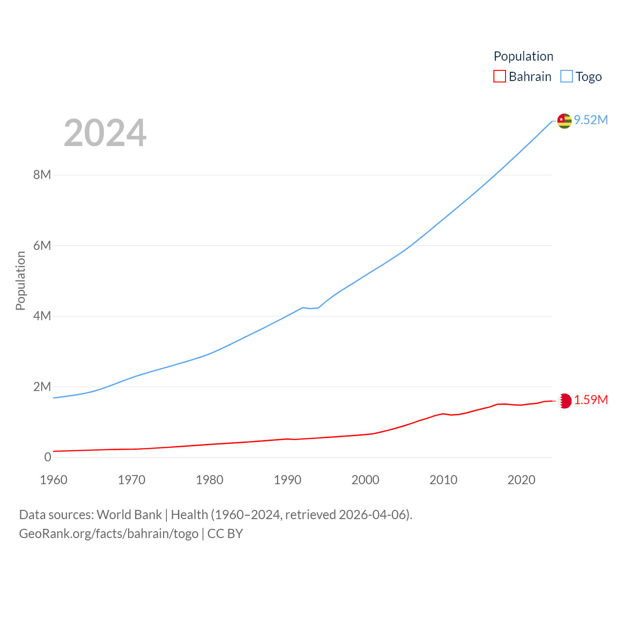 Bahrain has a population of 1.59M (ranked 151/197), compared with 9.52M in Togo (ranked 98/197). Bahrain's land area is 309 sq mi versus 21,000 sq mi for Togo (ranked 174th vs. 124th).