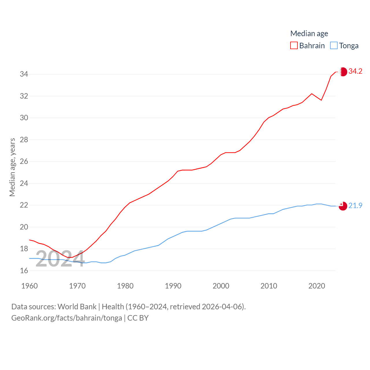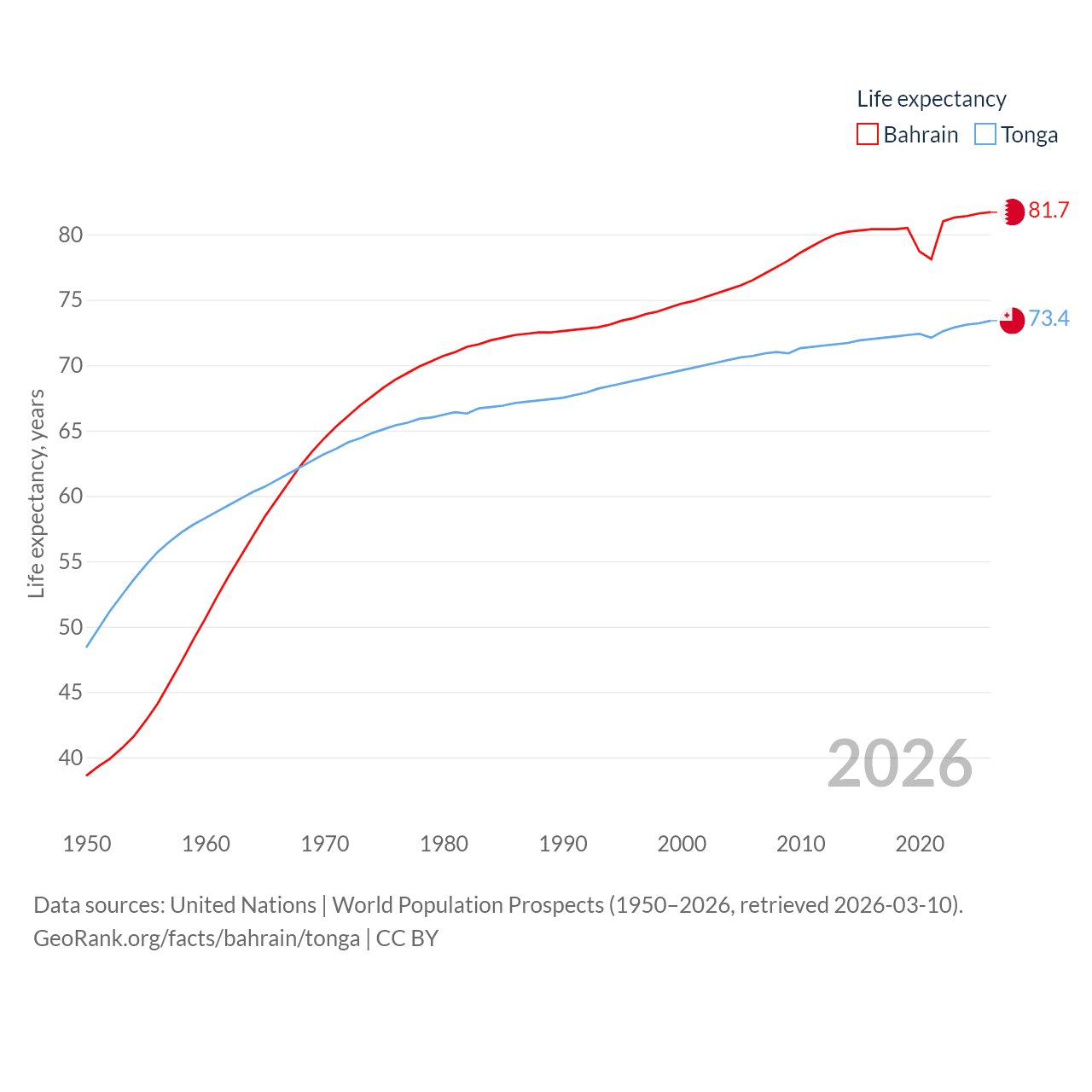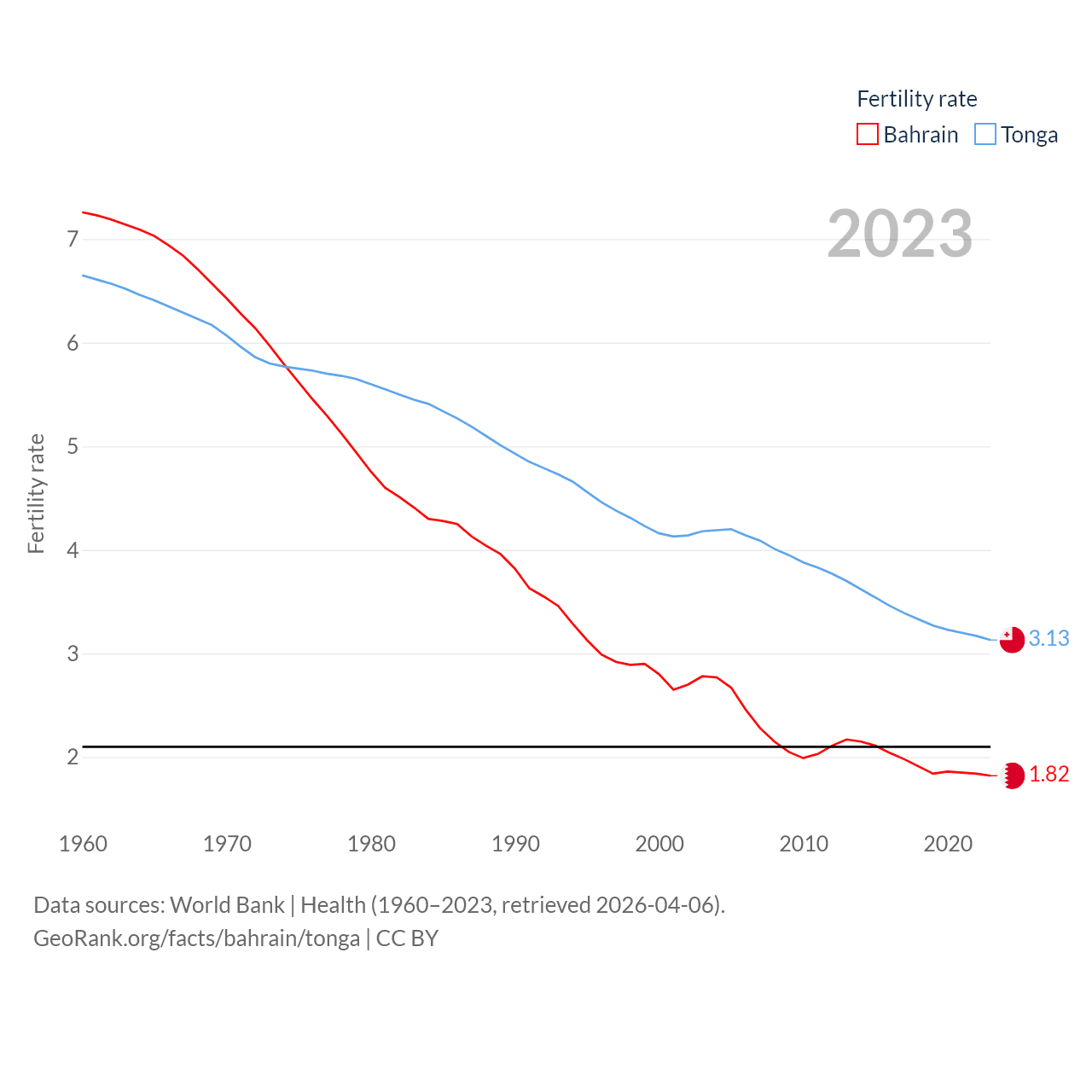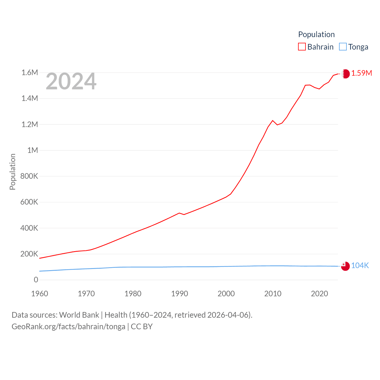 Bahrain has a population of 1.59M (ranked 151/197), compared with 104K in Tonga (ranked 183/197). Bahrain's land area is 309 sq mi versus 278 sq mi for Tonga (ranked 174th vs. 176th).