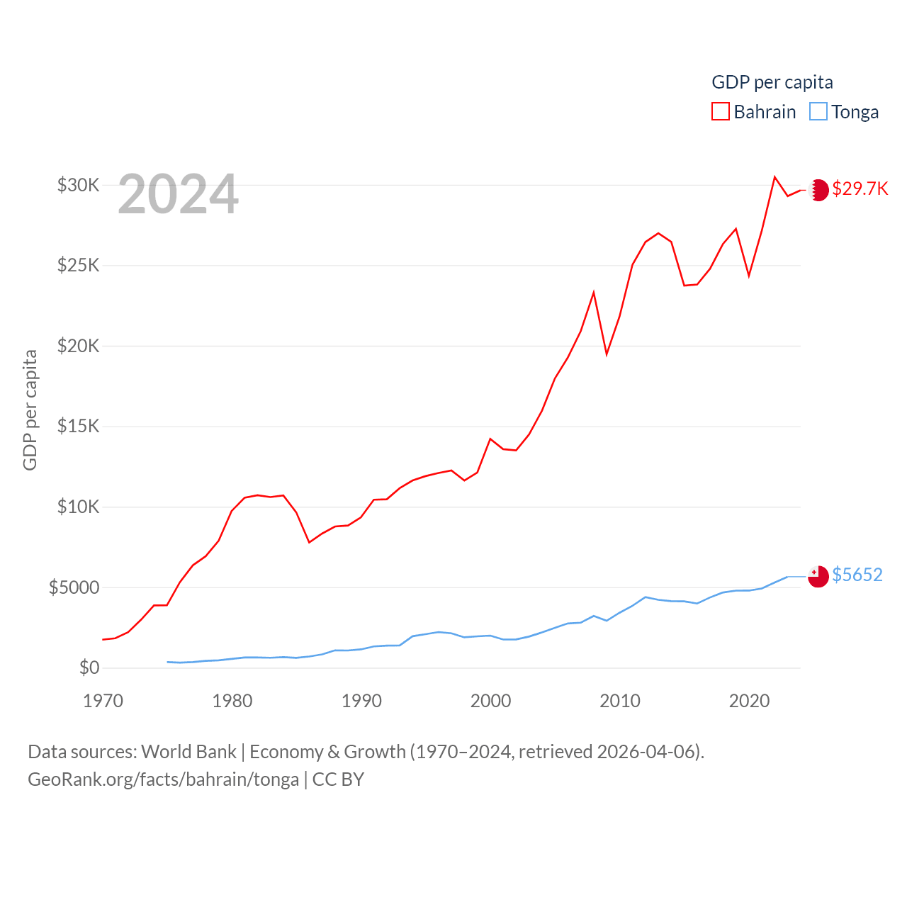 By GDP, Bahrain ranks 96/197 ($47.1B) and Tonga ranks 191/197 ($591M). By GDP per capita, Bahrain ranks 42/197 ($29,654), while Tonga ranks 115/197 ($5,652).