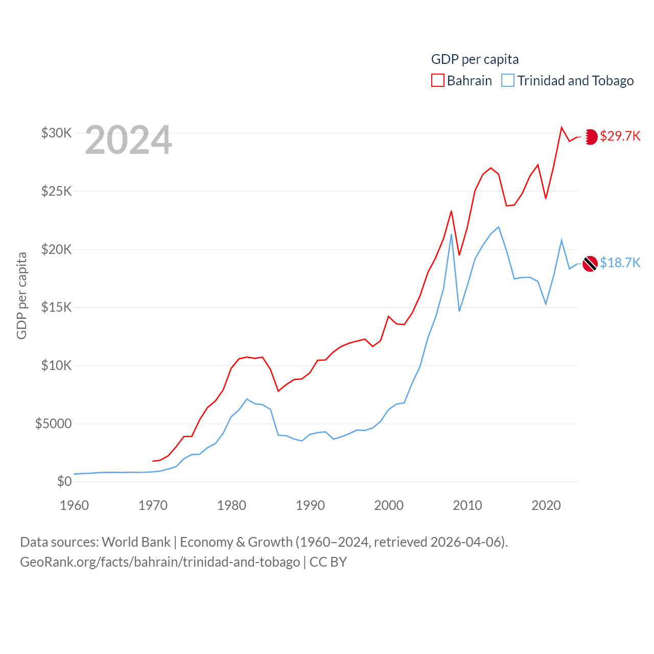 By GDP, Bahrain ranks 96/197 ($47.1B) and Trinidad and Tobago ranks 115/197 ($25.6B). By GDP per capita, Bahrain ranks 42/197 ($29,654), while Trinidad and Tobago ranks 61/197 ($18,733).