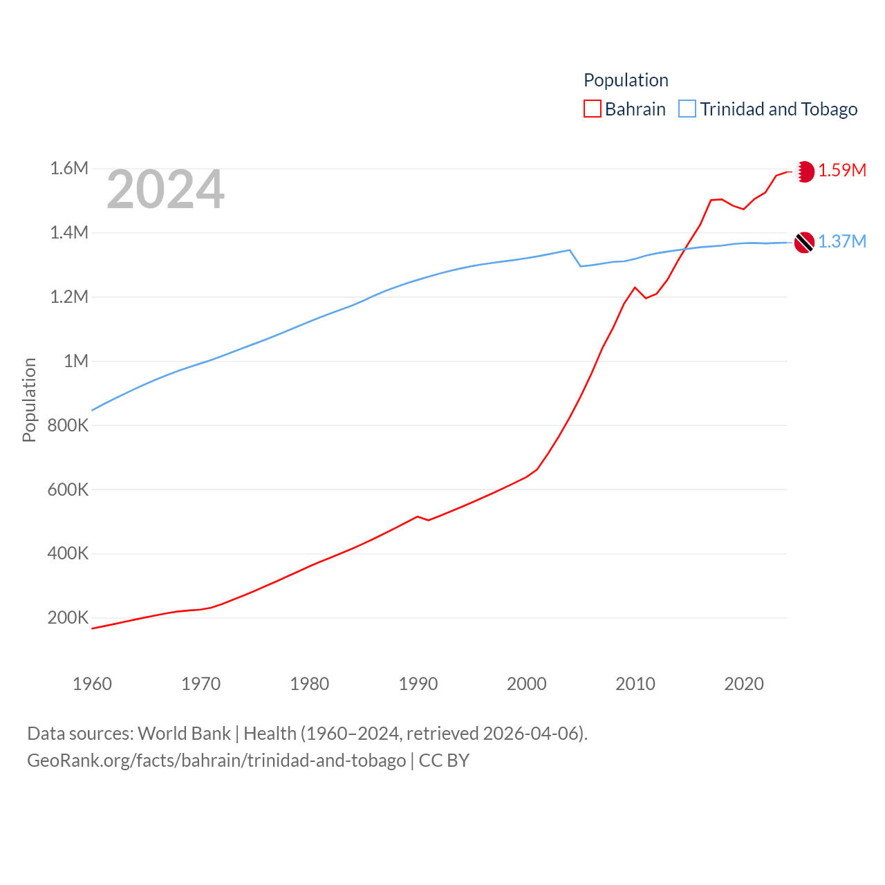 Bahrain has a population of 1.59M (ranked 151/197), compared with 1.37M in Trinidad and Tobago (ranked 154/197). Bahrain's land area is 309 sq mi versus 1,981 sq mi for Trinidad and Tobago (ranked 174th vs. 166th).