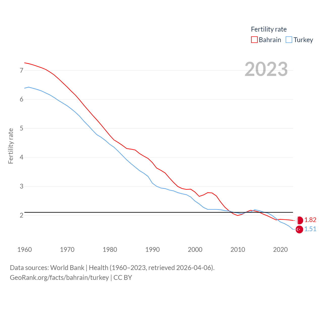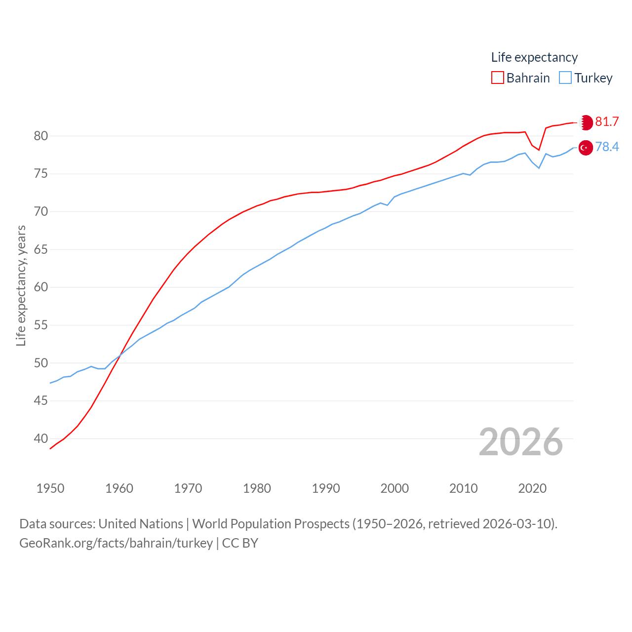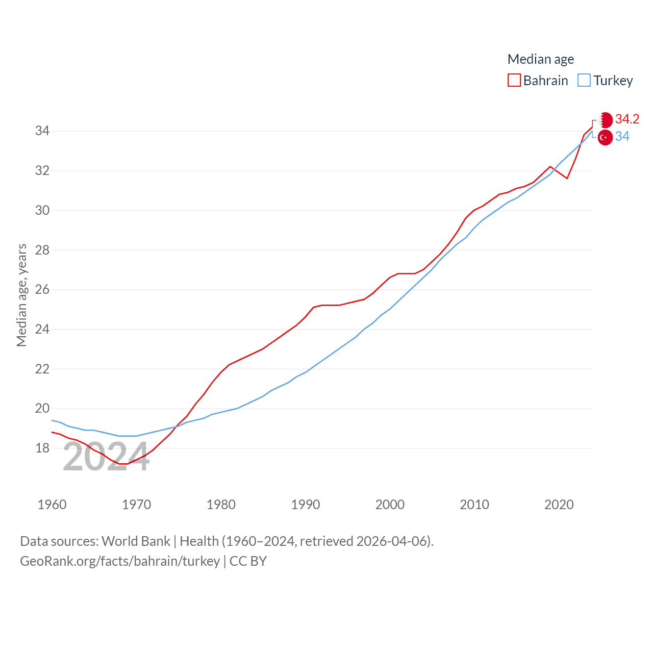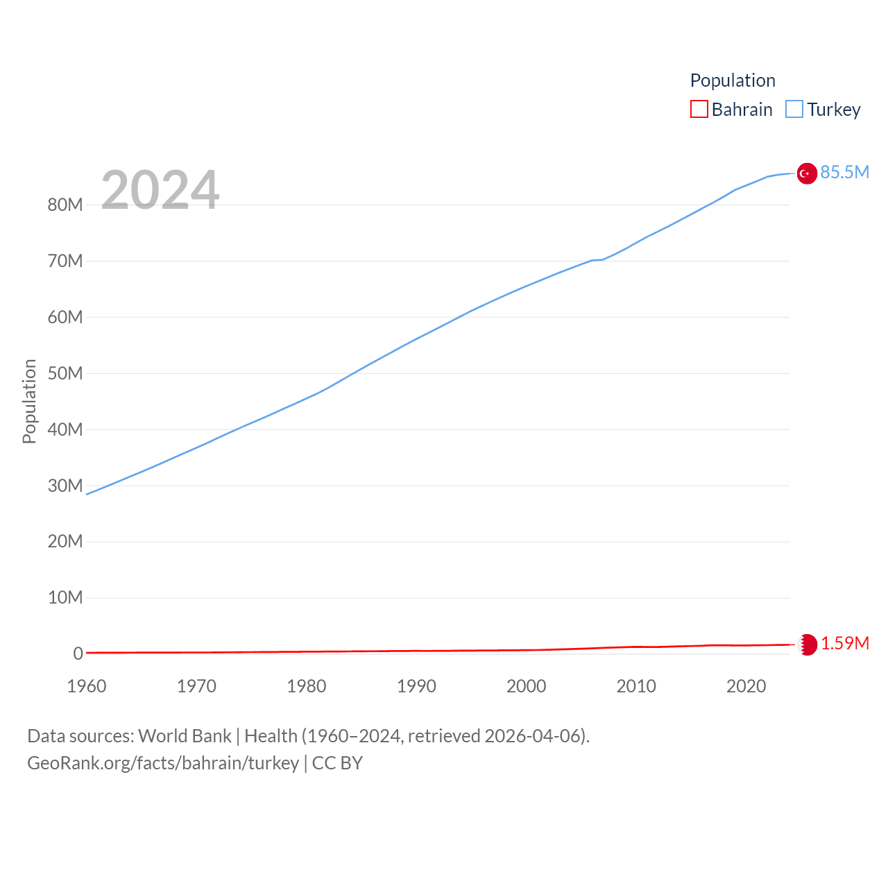 Bahrain has a population of 1.59M (ranked 151/197), compared with 85.5M in Turkey (ranked 18/197). Bahrain's land area is 309 sq mi versus 297,156 sq mi for Turkey (ranked 174th vs. 36th).
