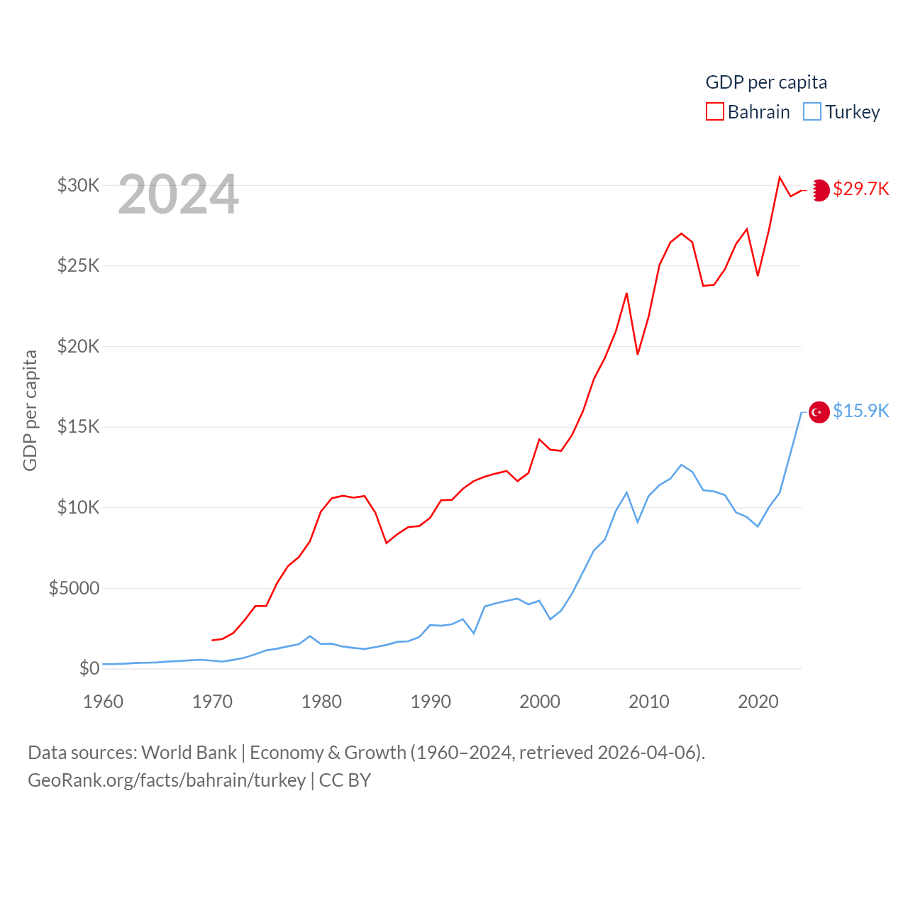 By GDP, Bahrain ranks 96/197 ($47.1B) and Turkey ranks 17/197 ($1.36T). By GDP per capita, Bahrain ranks 42/197 ($29,654), while Turkey ranks 66/197 ($15,893).