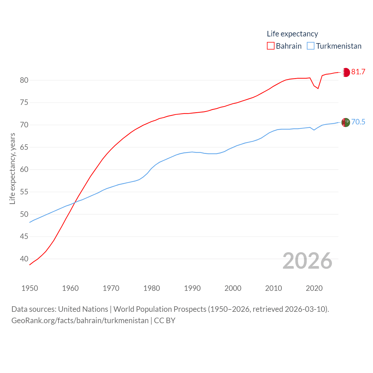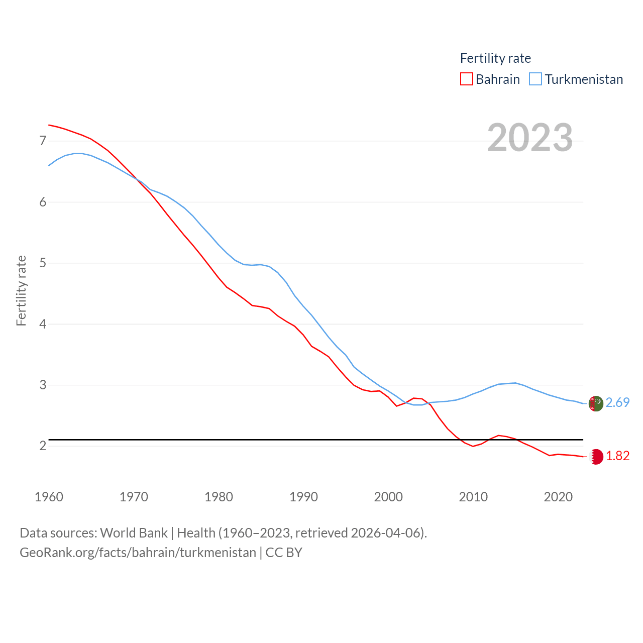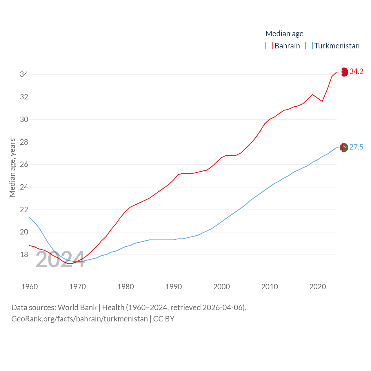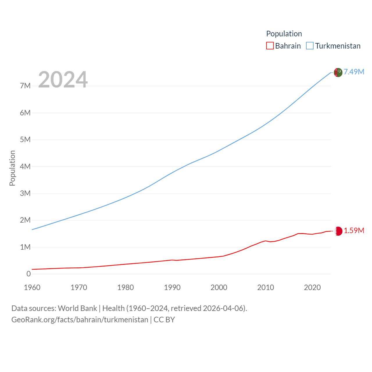 Bahrain has a population of 1.59M (ranked 151/197), compared with 7.49M in Turkmenistan (ranked 104/197). Bahrain's land area is 309 sq mi versus 181,441 sq mi for Turkmenistan (ranked 174th vs. 53rd).