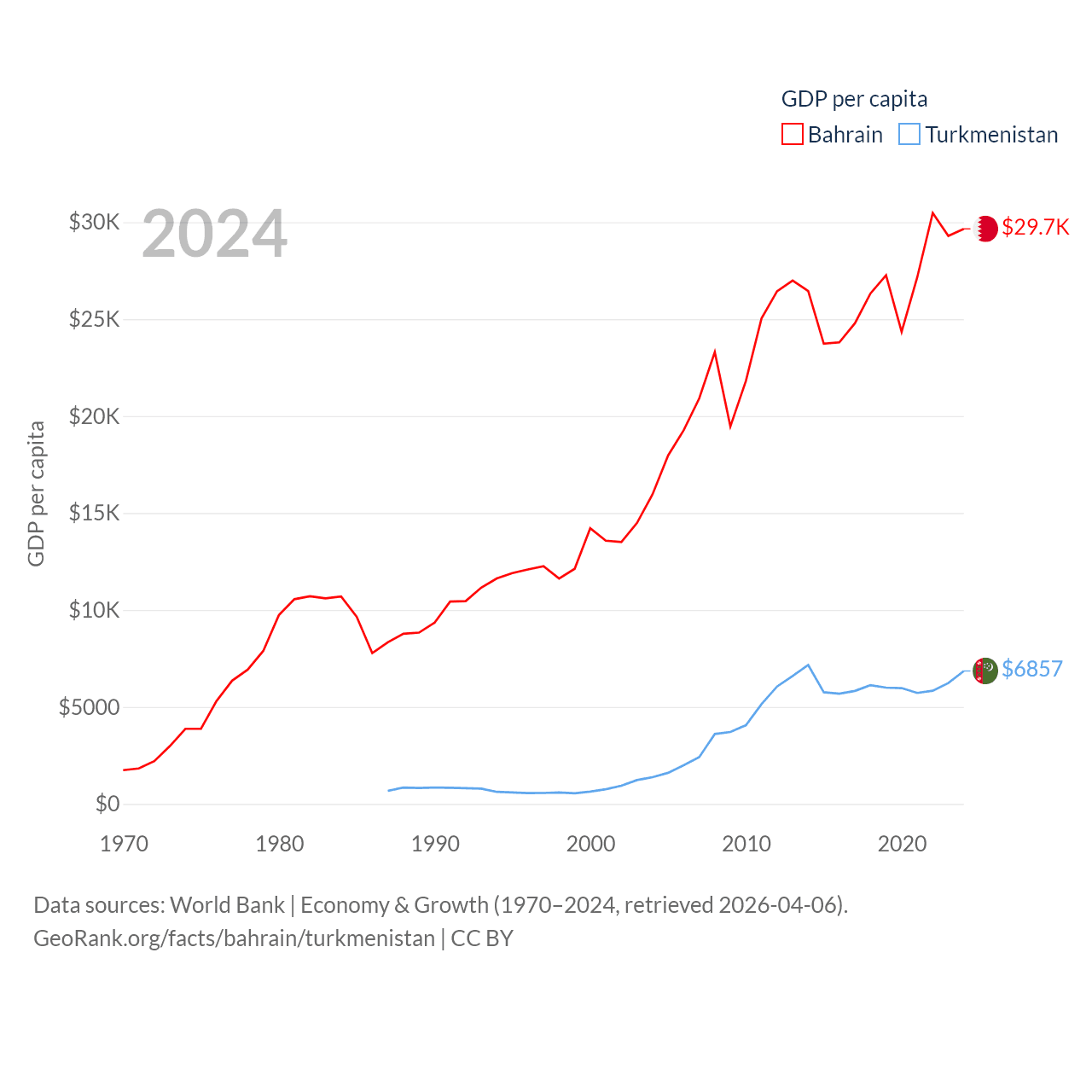 By GDP, Bahrain ranks 96/197 ($47.1B) and Turkmenistan ranks 92/197 ($51.4B). By GDP per capita, Bahrain ranks 42/197 ($29,654), while Turkmenistan ranks 104/197 ($6,857).