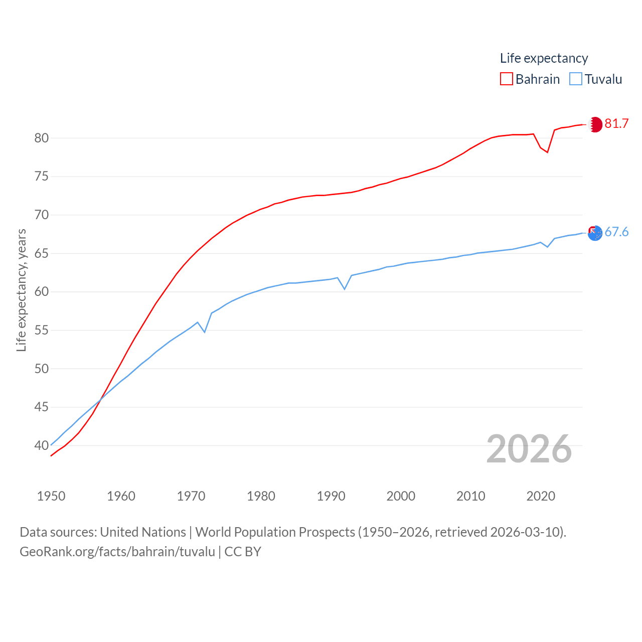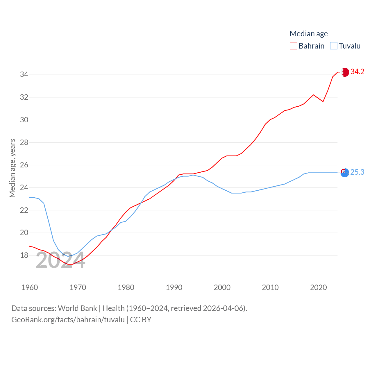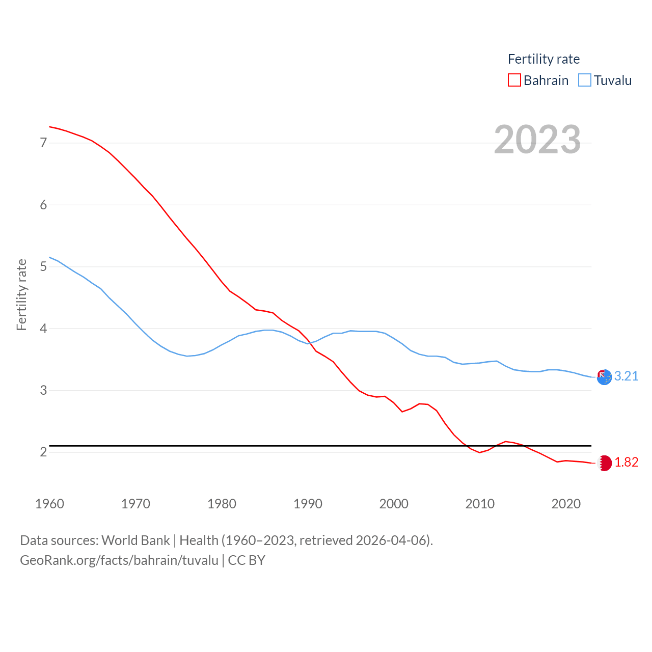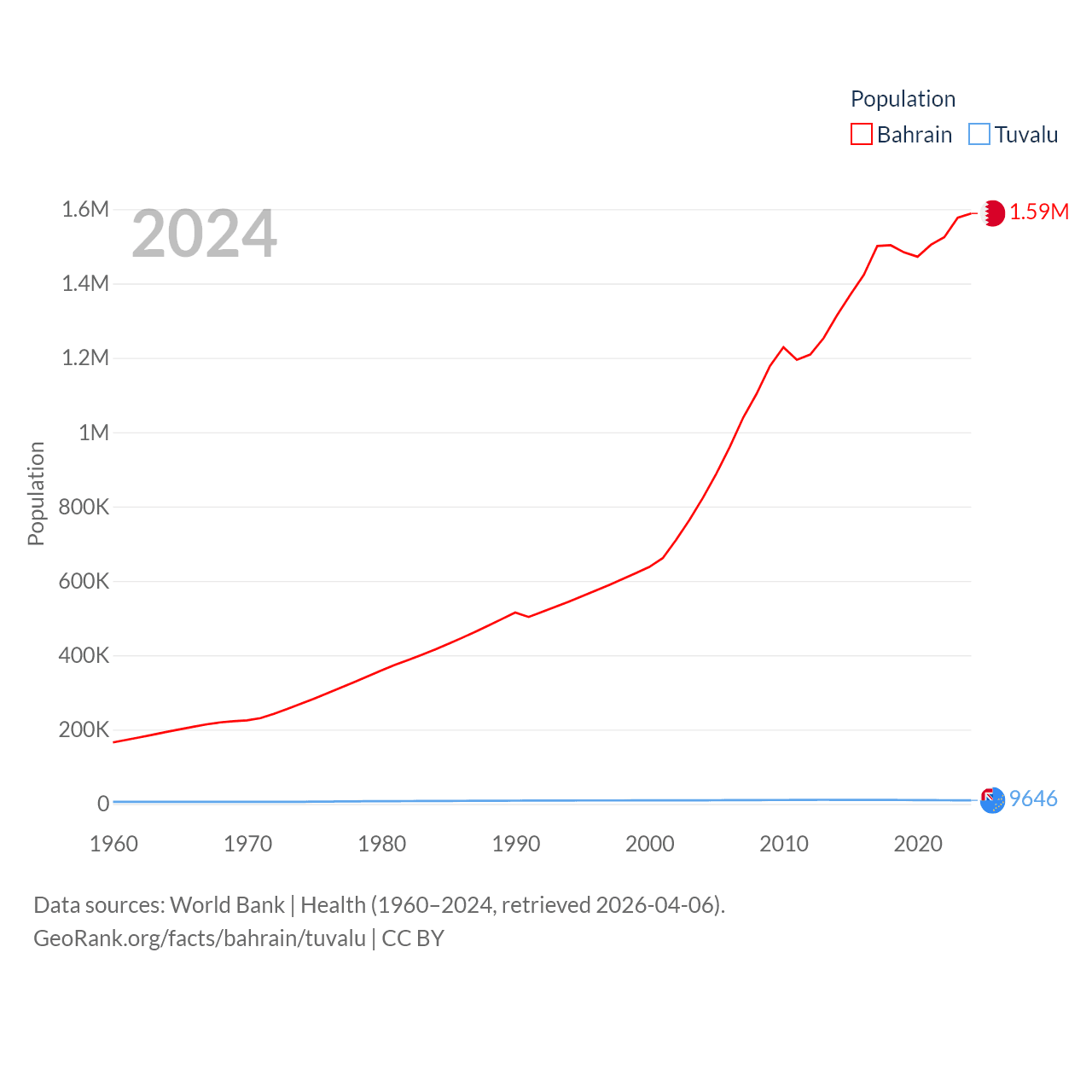 Bahrain has a population of 1.59M (ranked 151/197), compared with 9.65K in Tuvalu (ranked 196/197). Bahrain's land area is 309 sq mi versus 11.6 sq mi for Tuvalu (ranked 174th vs. 194th).