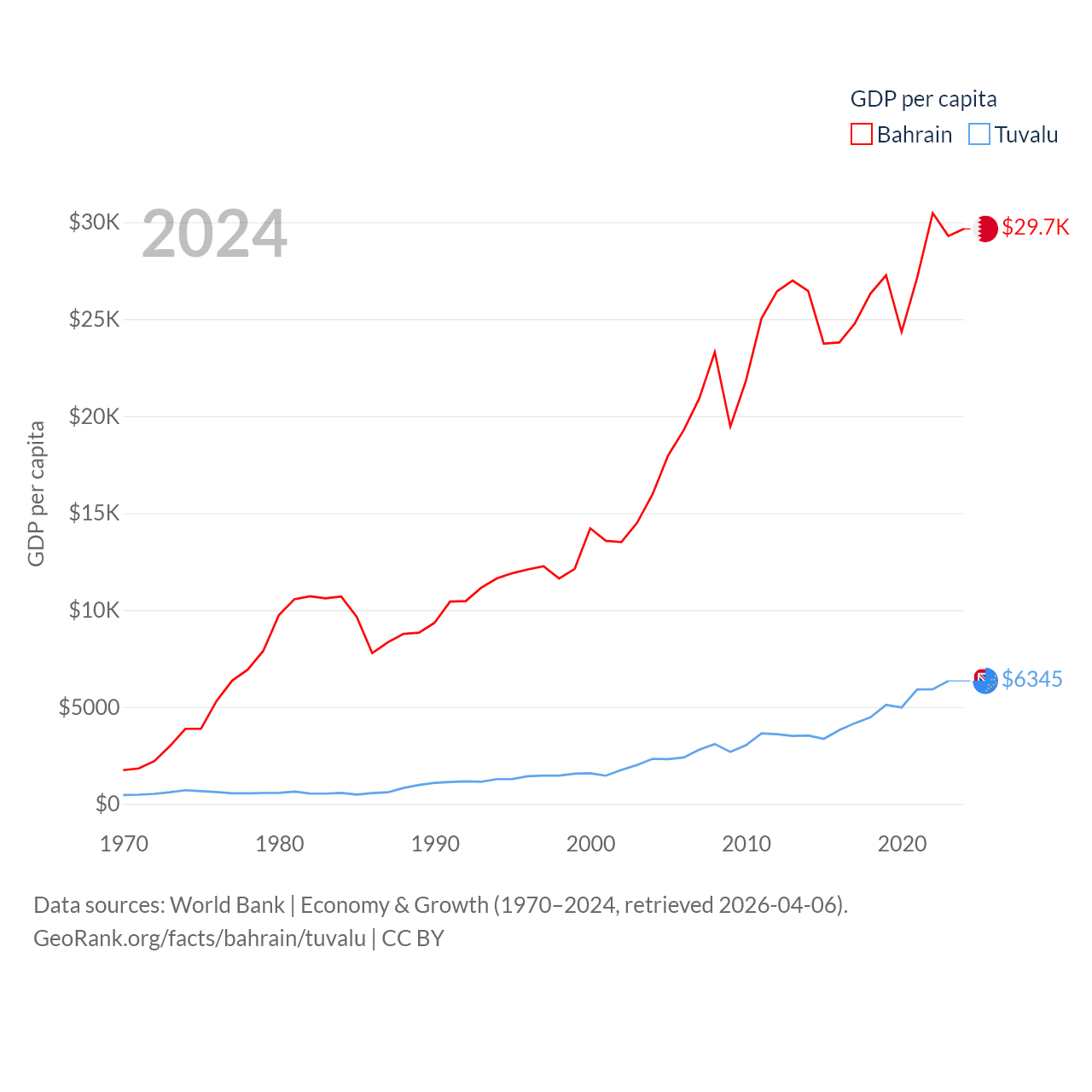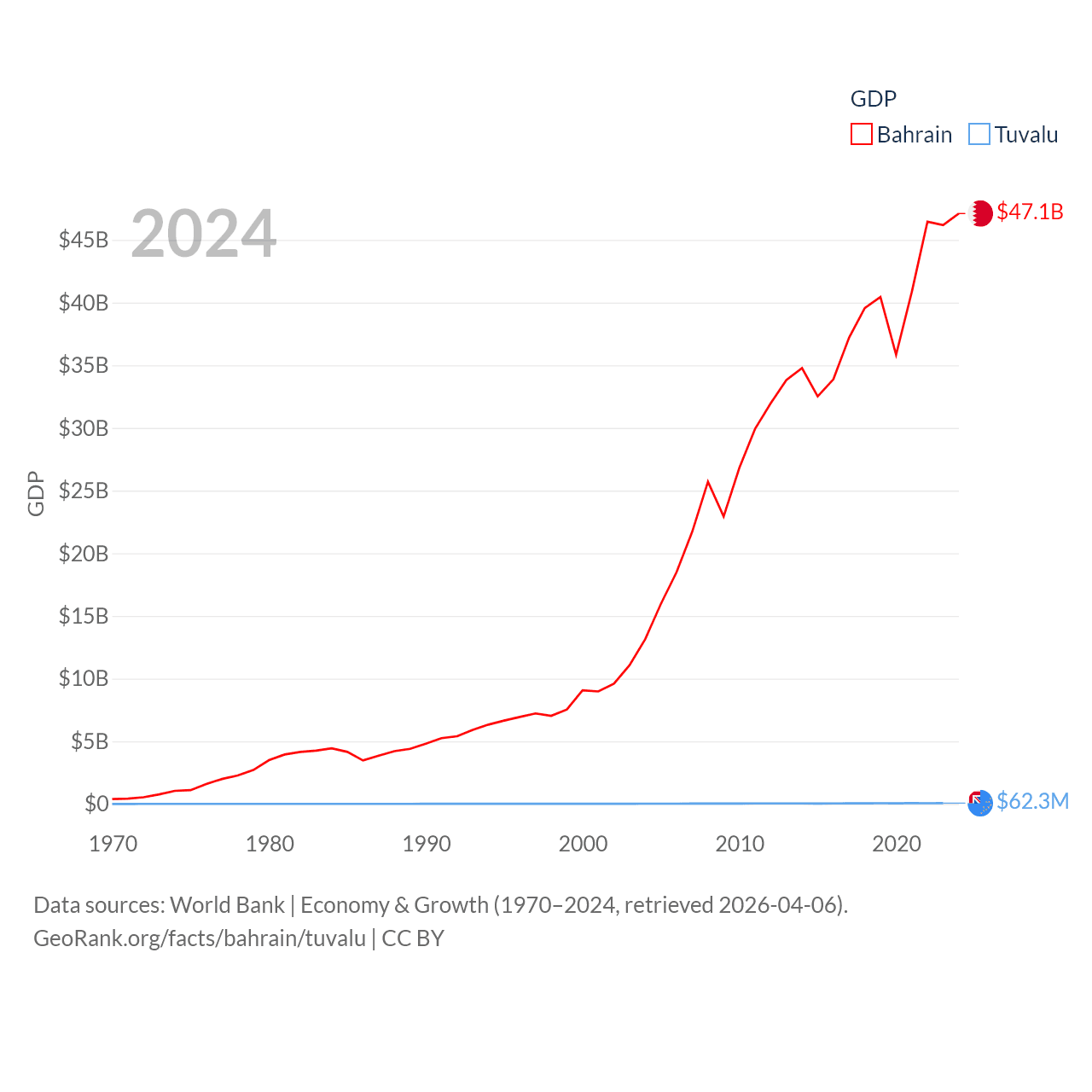 By GDP, Bahrain ranks 96/197 ($47.1B) and Tuvalu ranks 196/197 ($62.3M). By GDP per capita, Bahrain ranks 42/197 ($29,654), while Tuvalu ranks 110/197 ($6,345).