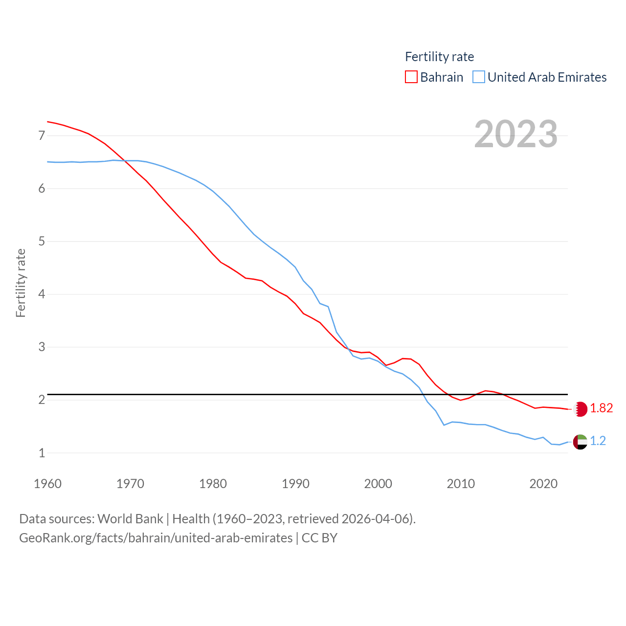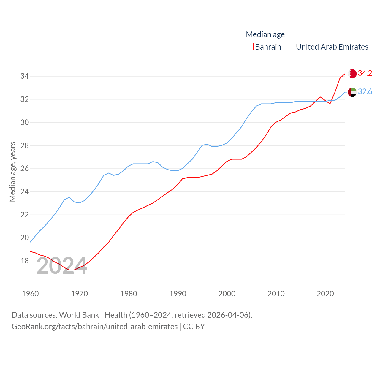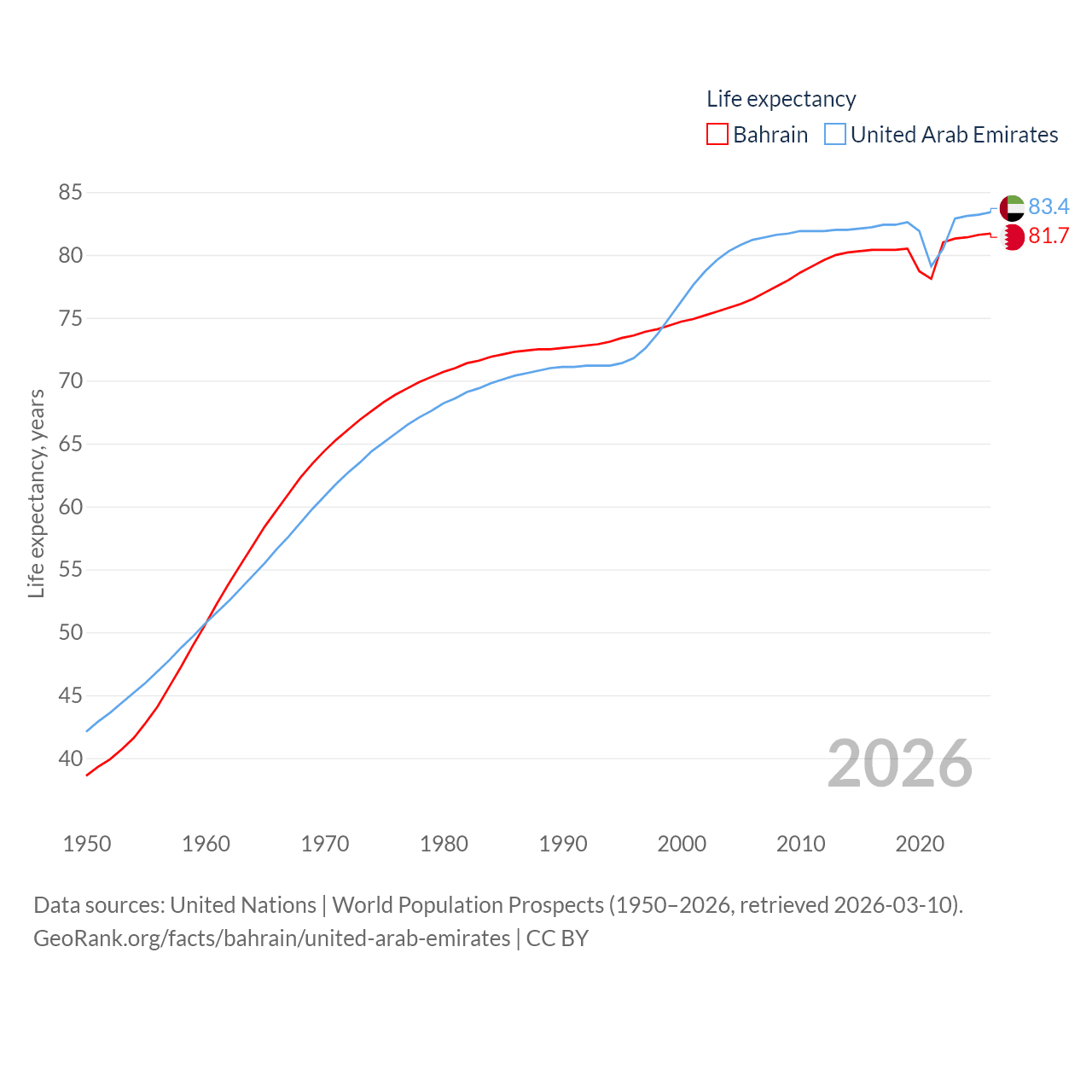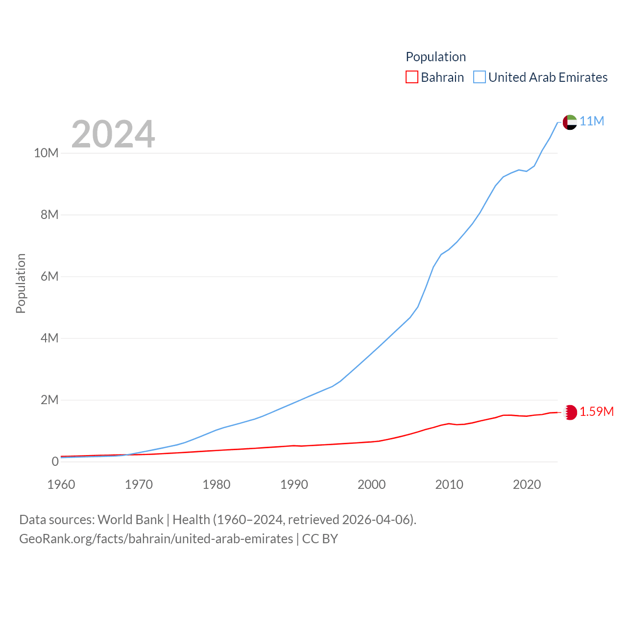 Bahrain has a population of 1.59M (ranked 151/197), compared with 11M in The United Arab Emirates (ranked 86/197). Bahrain's land area is 309 sq mi versus 27,421 sq mi for The United Arab Emirates (ranked 174th vs. 117th).