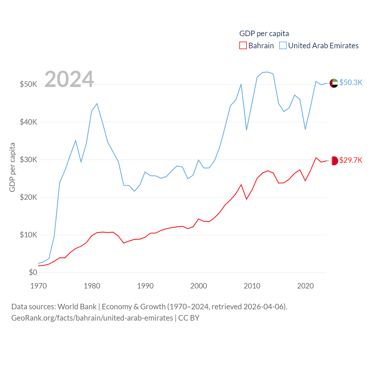 By GDP, Bahrain ranks 96/197 ($47.1B) and The United Arab Emirates ranks 27/197 ($552B). By GDP per capita, Bahrain ranks 42/197 ($29,654), while The United Arab Emirates ranks 24/197 ($50,274).