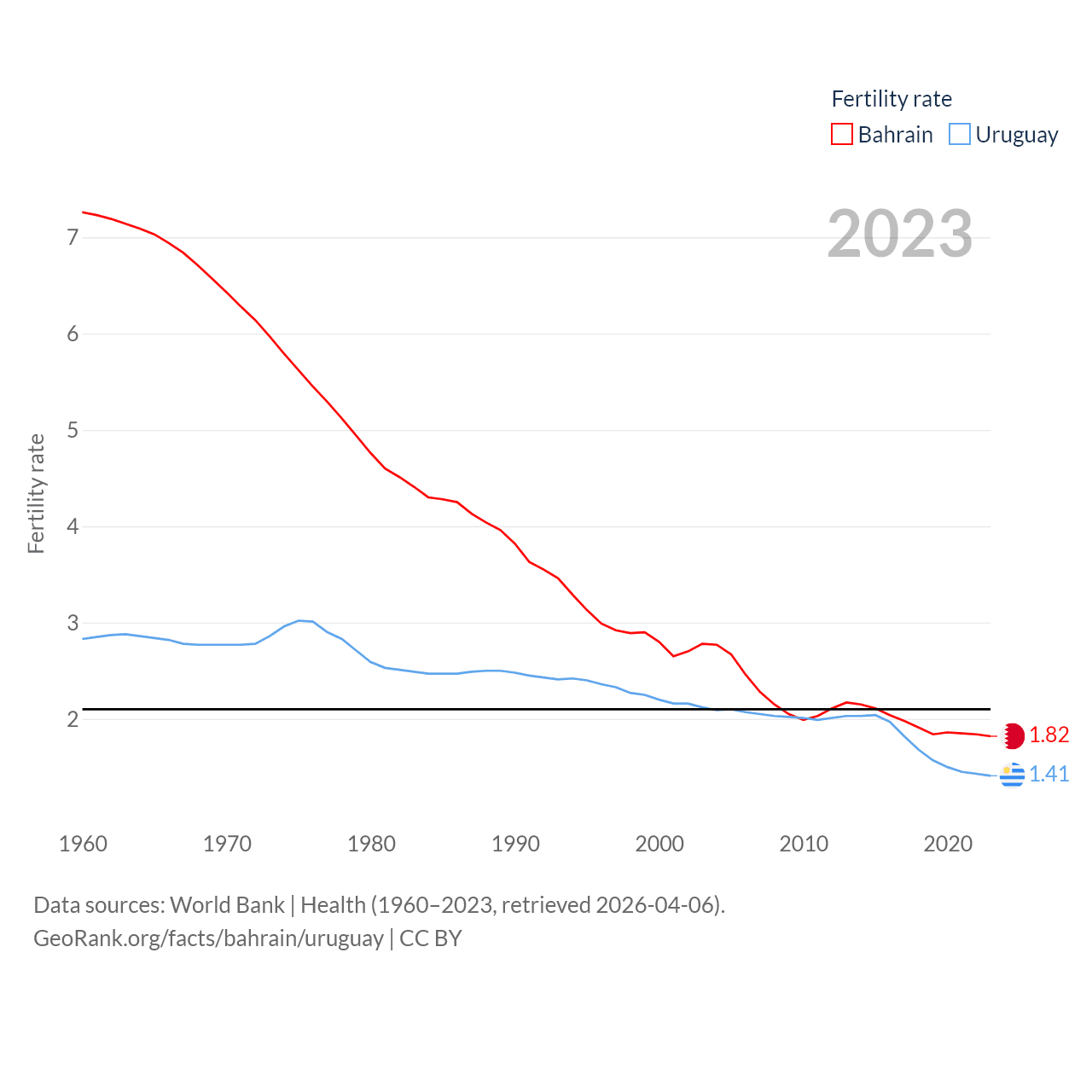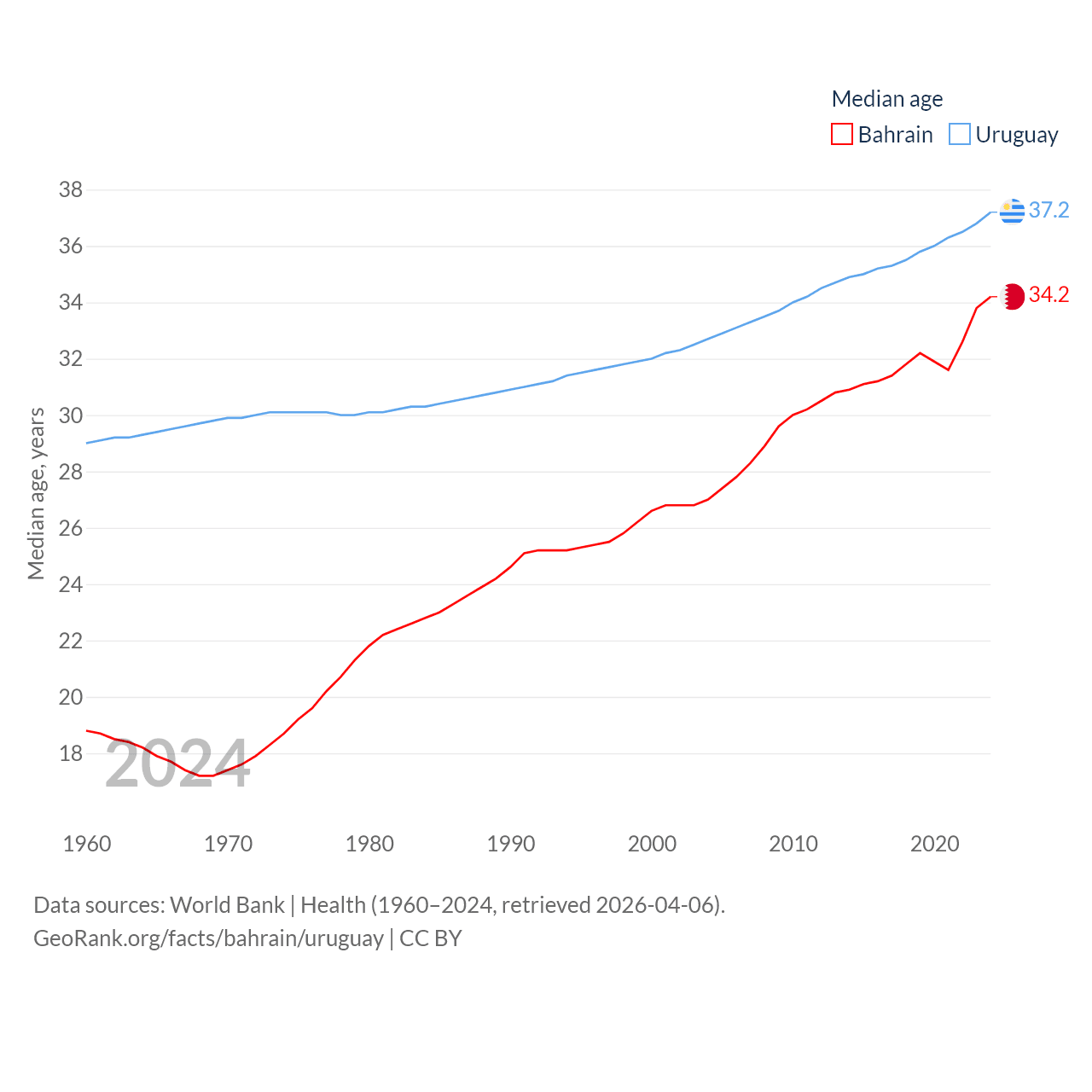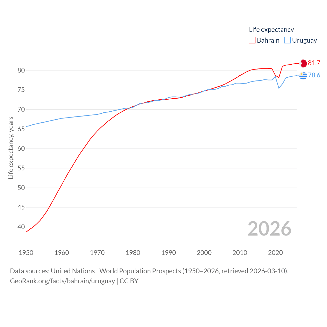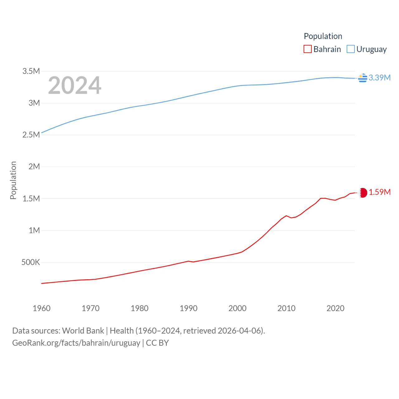 Bahrain has a population of 1.59M (ranked 151/197), compared with 3.39M in Uruguay (ranked 133/197). Bahrain's land area is 309 sq mi versus 67,576 sq mi for Uruguay (ranked 174th vs. 89th).