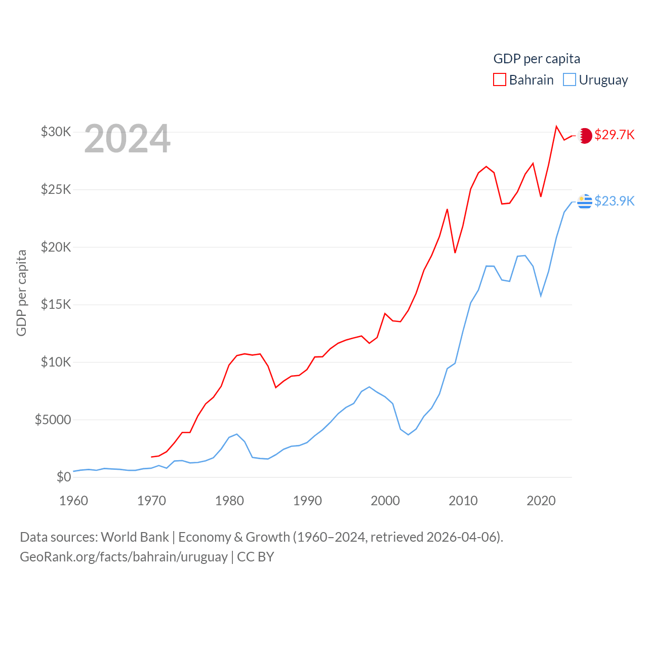 By GDP, Bahrain ranks 96/197 ($47.1B) and Uruguay ranks 81/197 ($81B). By GDP per capita, Bahrain ranks 42/197 ($29,654), while Uruguay ranks 52/197 ($23,907).