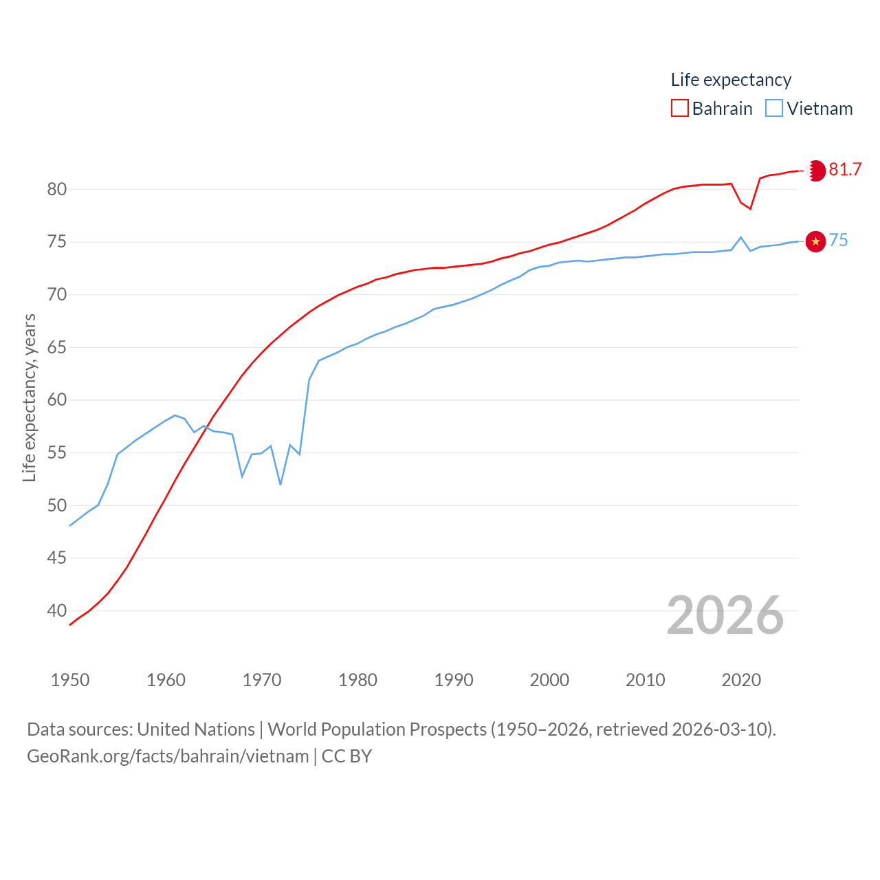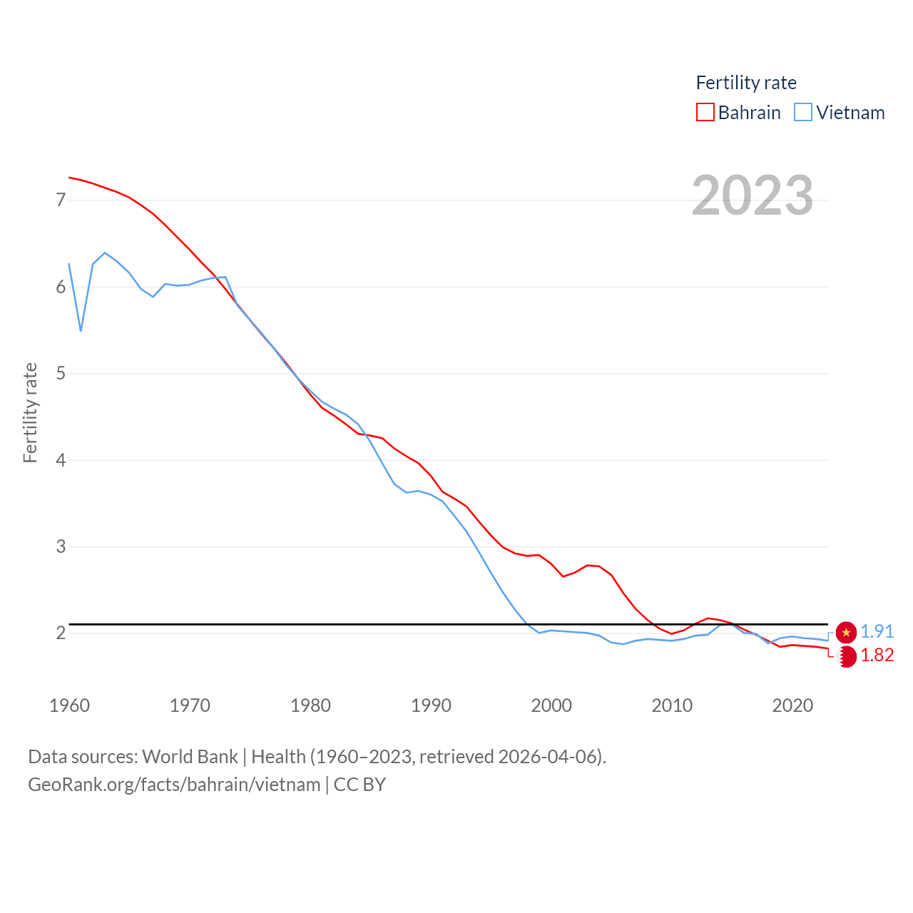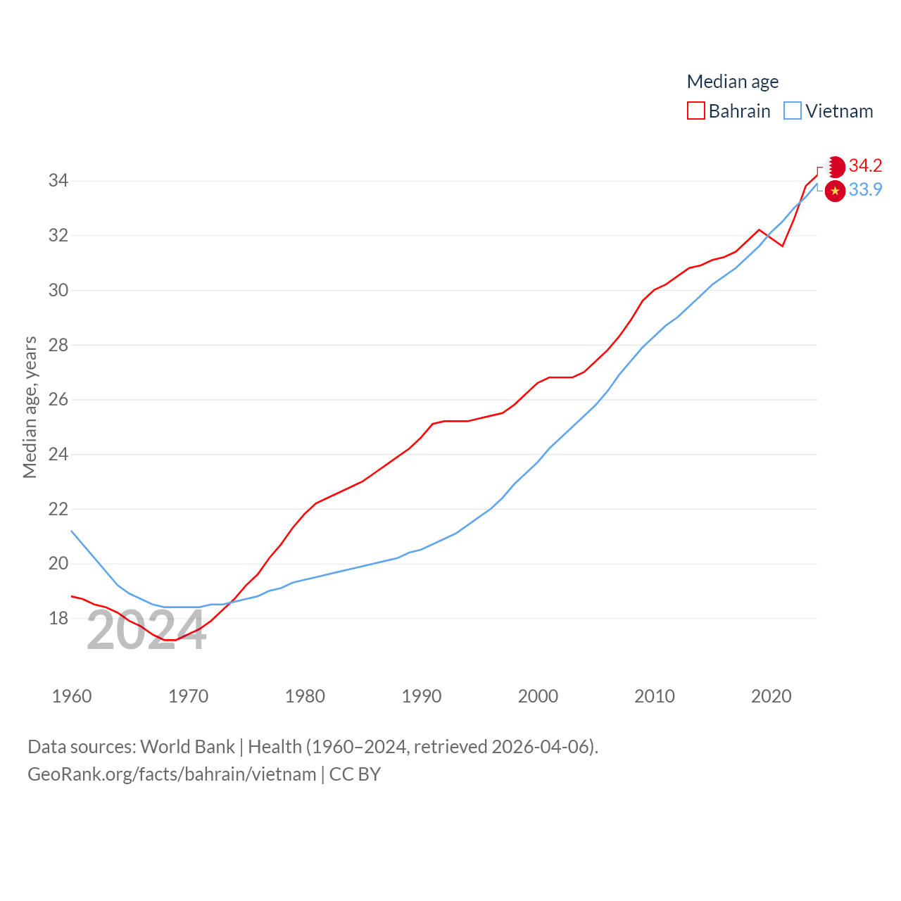 Bahrain has a population of 1.59M (ranked 151/197), compared with 101M in Vietnam (ranked 16/197). Bahrain's land area is 309 sq mi versus 121,016 sq mi for Vietnam (ranked 174th vs. 67th).
