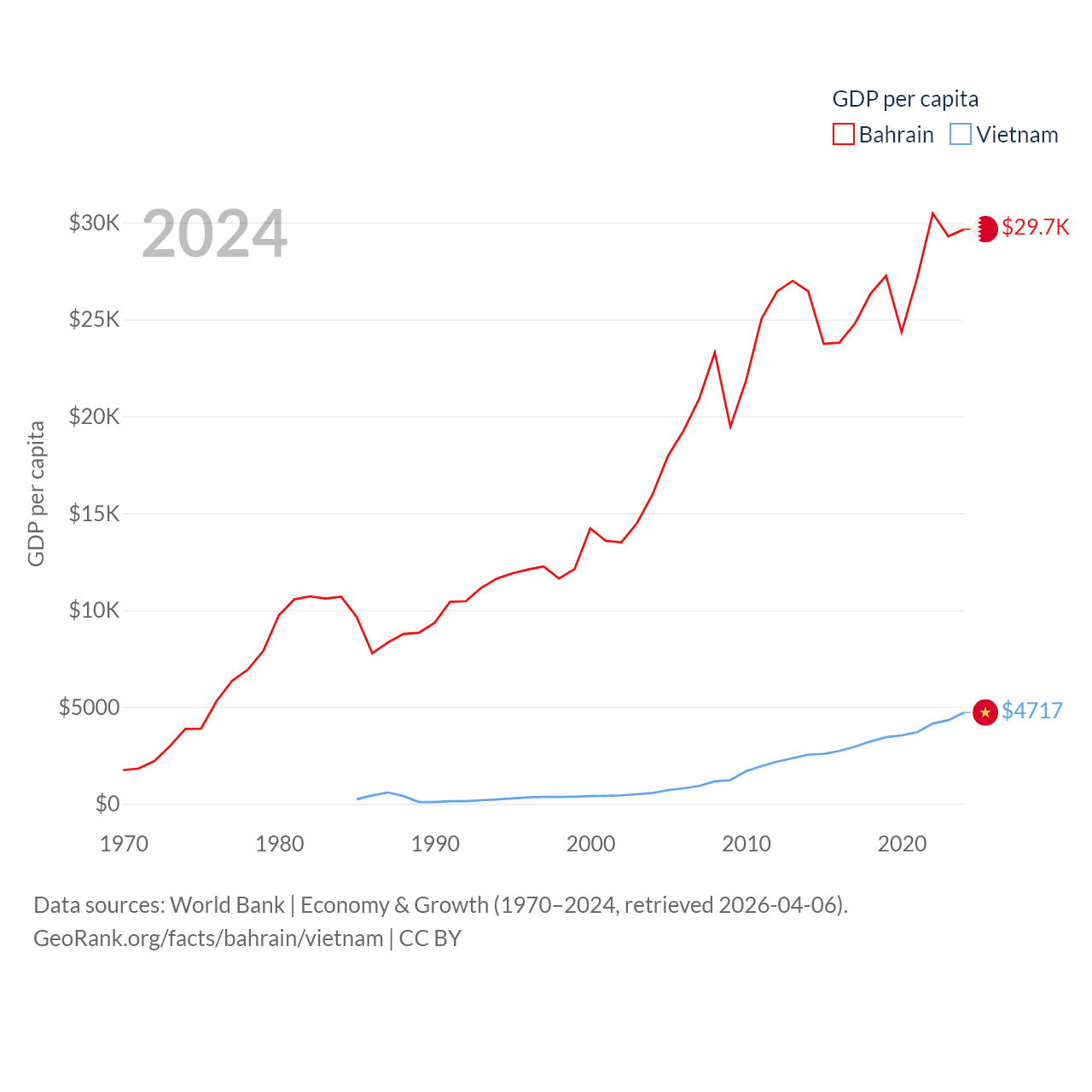 By GDP, Bahrain ranks 96/197 ($47.1B) and Vietnam ranks 33/197 ($476B). By GDP per capita, Bahrain ranks 42/197 ($29,654), while Vietnam ranks 122/197 ($4,717).