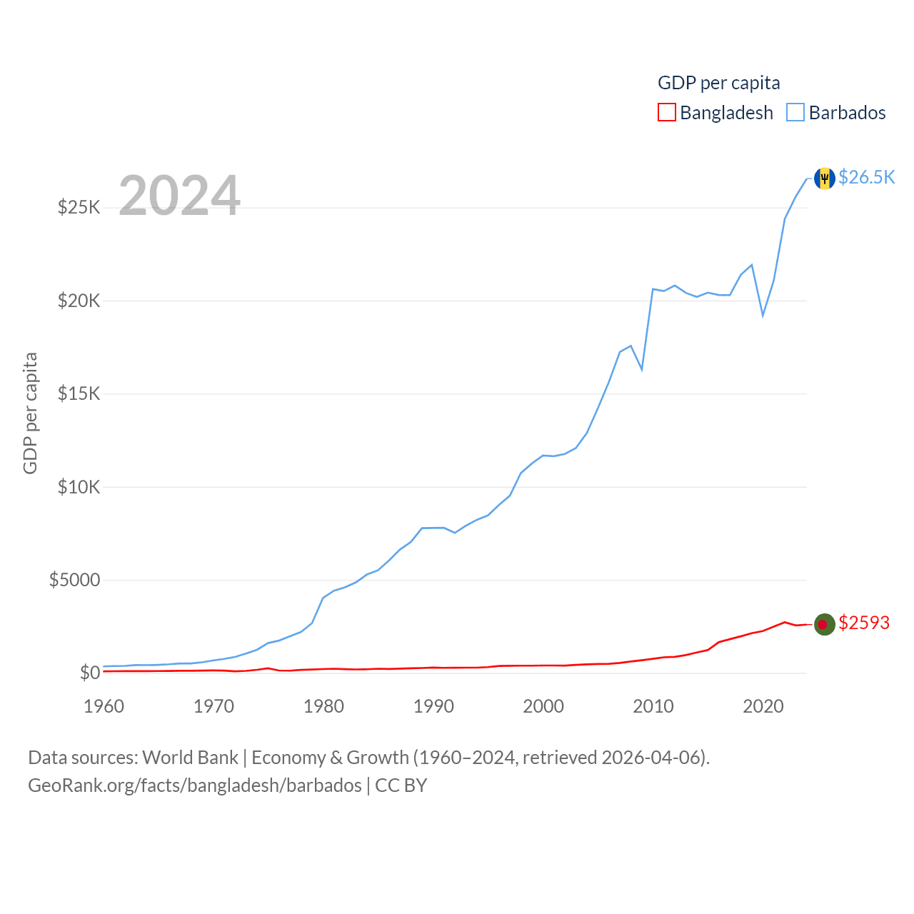 By GDP, Bangladesh ranks 36/197 ($450B) and Barbados ranks 157/197 ($7.5B). By GDP per capita, Bangladesh ranks 146/197 ($2,593), while Barbados ranks 46/197 ($26,545).