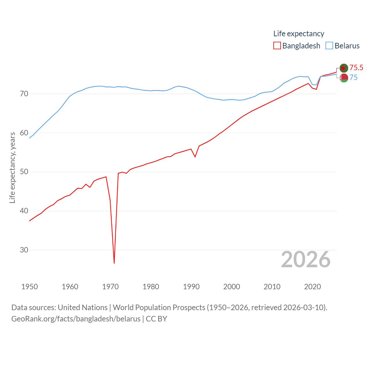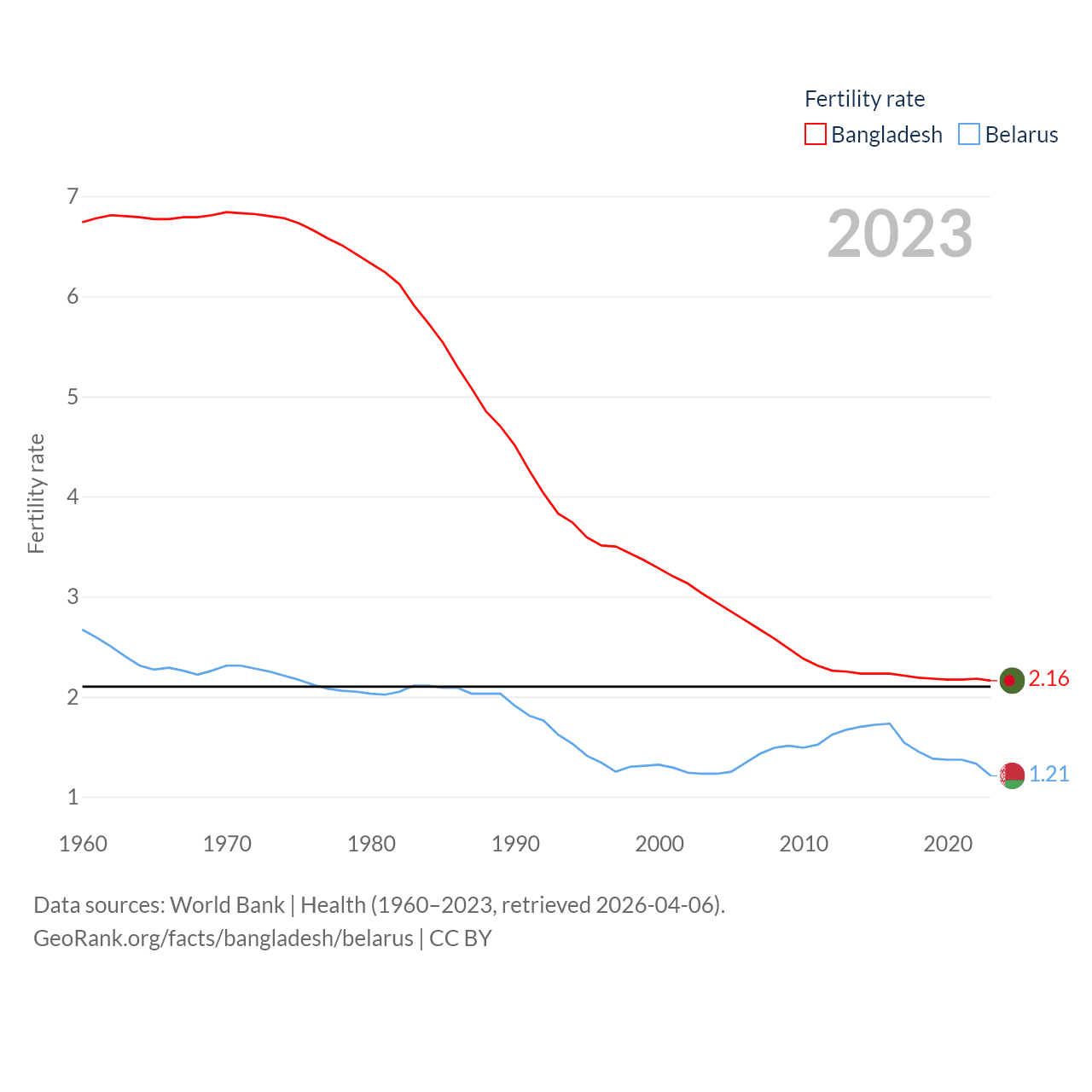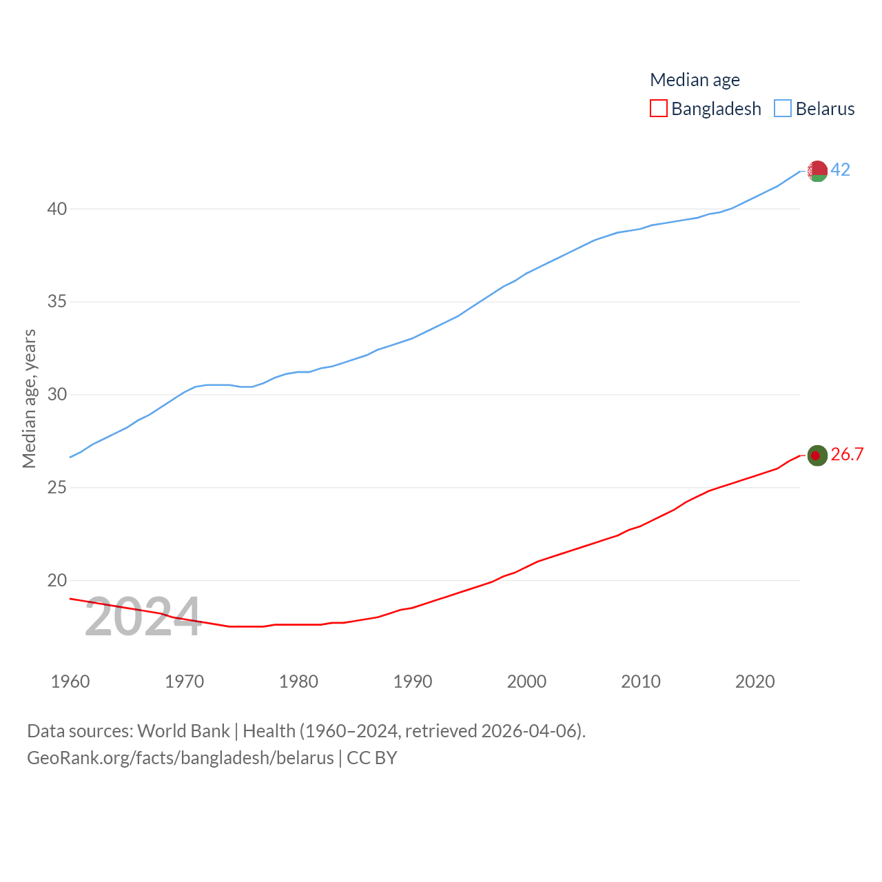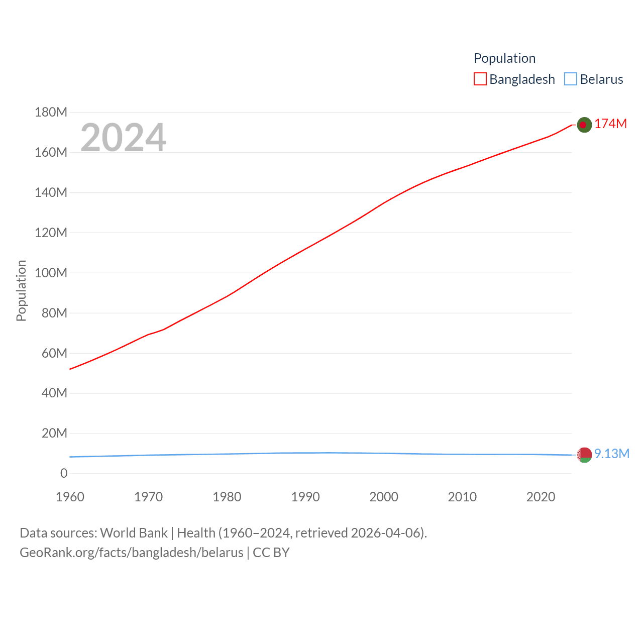 Bangladesh has a population of 174M (ranked 8/197), compared with 9.13M in Belarus (ranked 100/197). Bangladesh's land area is 50,186 sq mi versus 78,372 sq mi for Belarus (ranked 94th vs. 83rd).