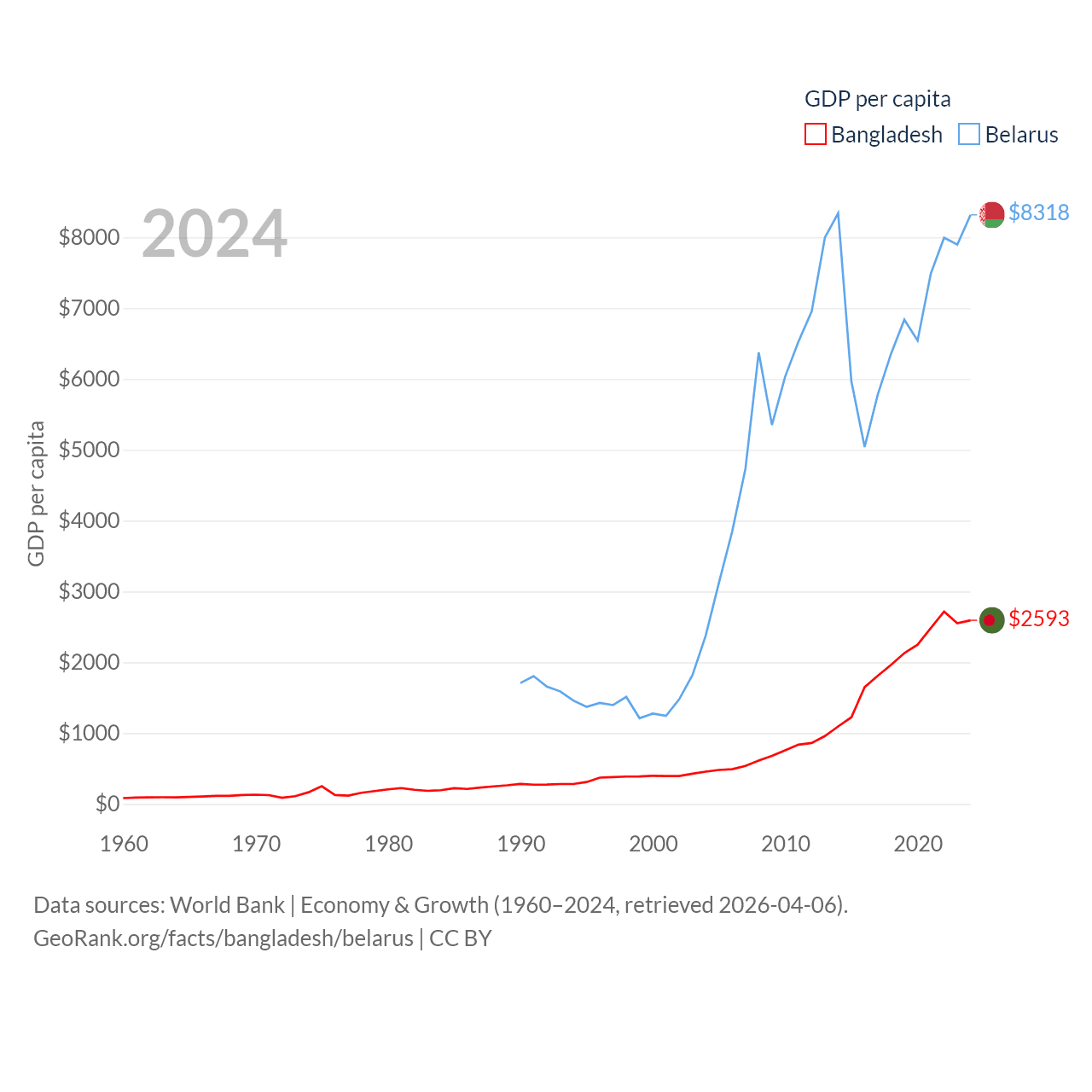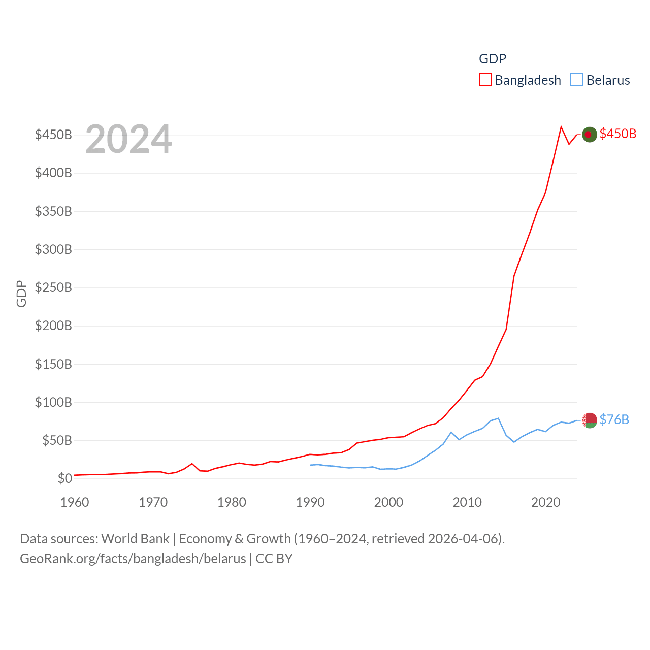 By GDP, Bangladesh ranks 36/197 ($450B) and Belarus ranks 83/197 ($76B). By GDP per capita, Bangladesh ranks 146/197 ($2,593), while Belarus ranks 92/197 ($8,318).