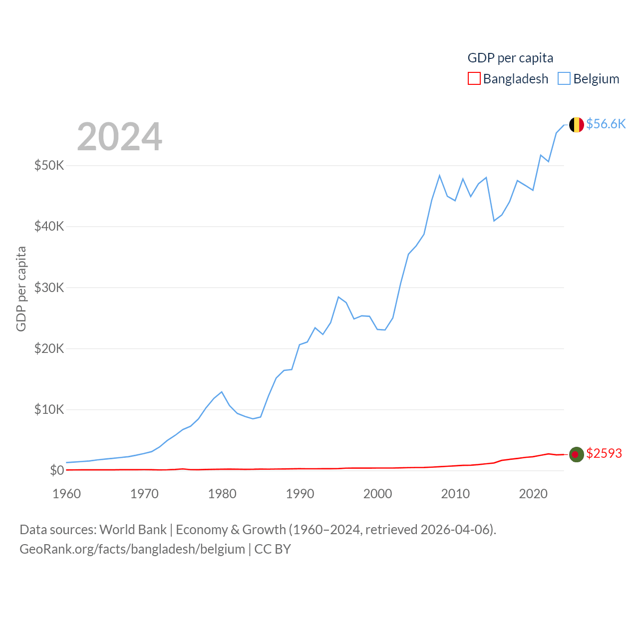 By GDP, Bangladesh ranks 36/197 ($450B) and Belgium ranks 23/197 ($671B). By GDP per capita, Bangladesh ranks 146/197 ($2,593), while Belgium ranks 18/197 ($56,615).