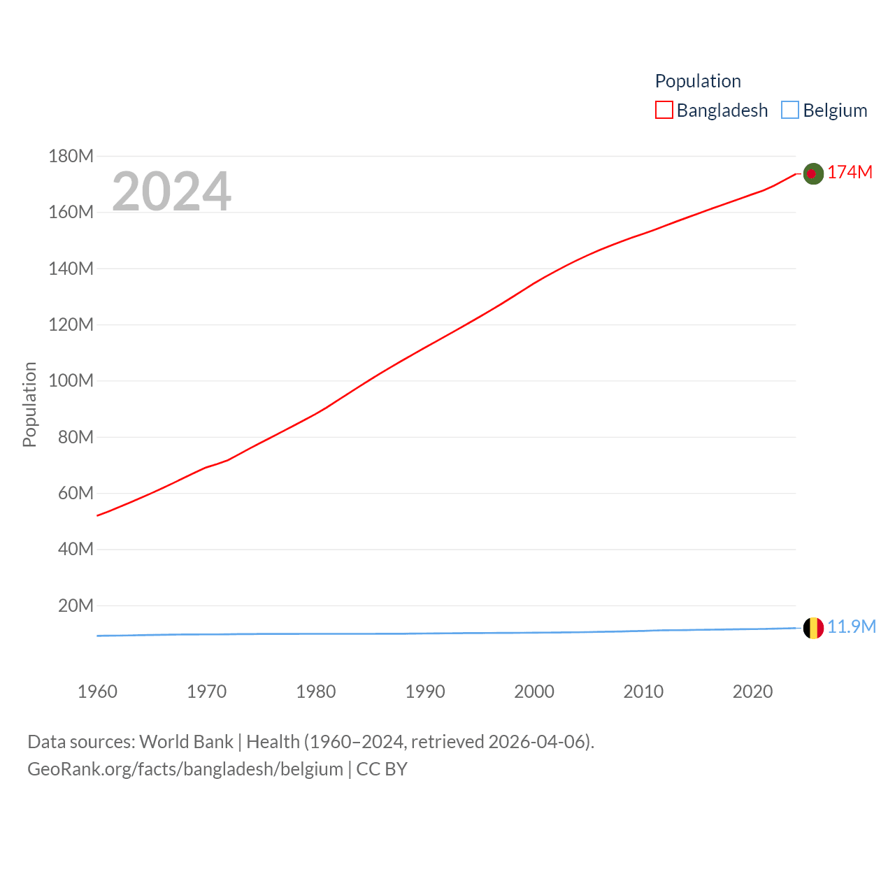 Bangladesh has a population of 174M (ranked 8/197), compared with 11.9M in Belgium (ranked 82/197). Bangladesh's land area is 50,186 sq mi versus 11,774 sq mi for Belgium (ranked 94th vs. 136th).