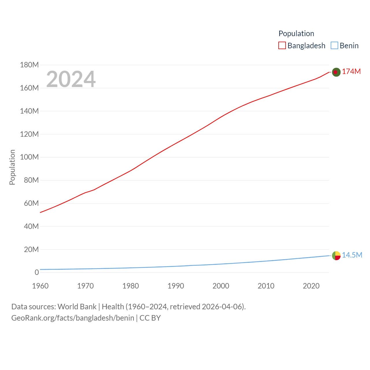 Bangladesh has a population of 174M (ranked 8/197), compared with 14.5M in Benin (ranked 76/197). Bangladesh's land area is 50,186 sq mi versus 43,537 sq mi for Benin (ranked 94th vs. 99th).