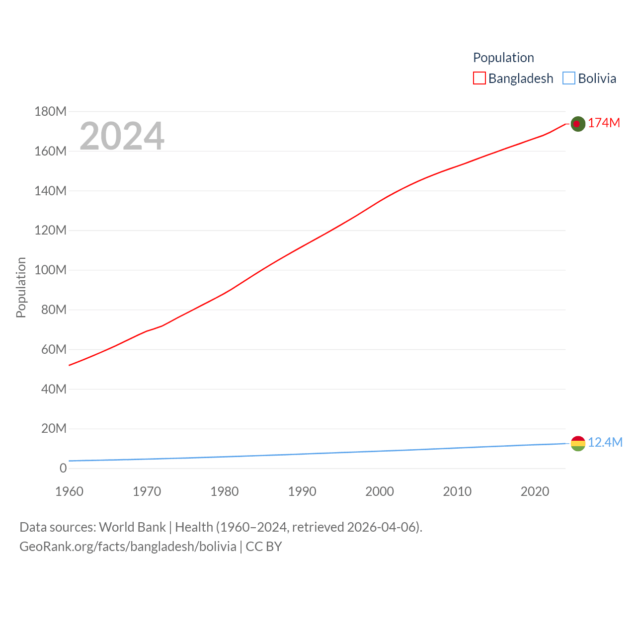 Bangladesh has a population of 174M (ranked 8/197), compared with 12.4M in Bolivia (ranked 79/197). Bangladesh's land area is 50,186 sq mi versus 418,264 sq mi for Bolivia (ranked 94th vs. 27th).