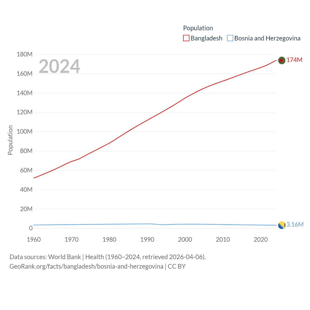 Bangladesh has a population of 174M (ranked 8/197), compared with 3.16M in Bosnia and Herzegovina (ranked 134/197). Bangladesh's land area is 50,186 sq mi versus 19,768 sq mi for Bosnia and Herzegovina (ranked 94th vs. 125th).