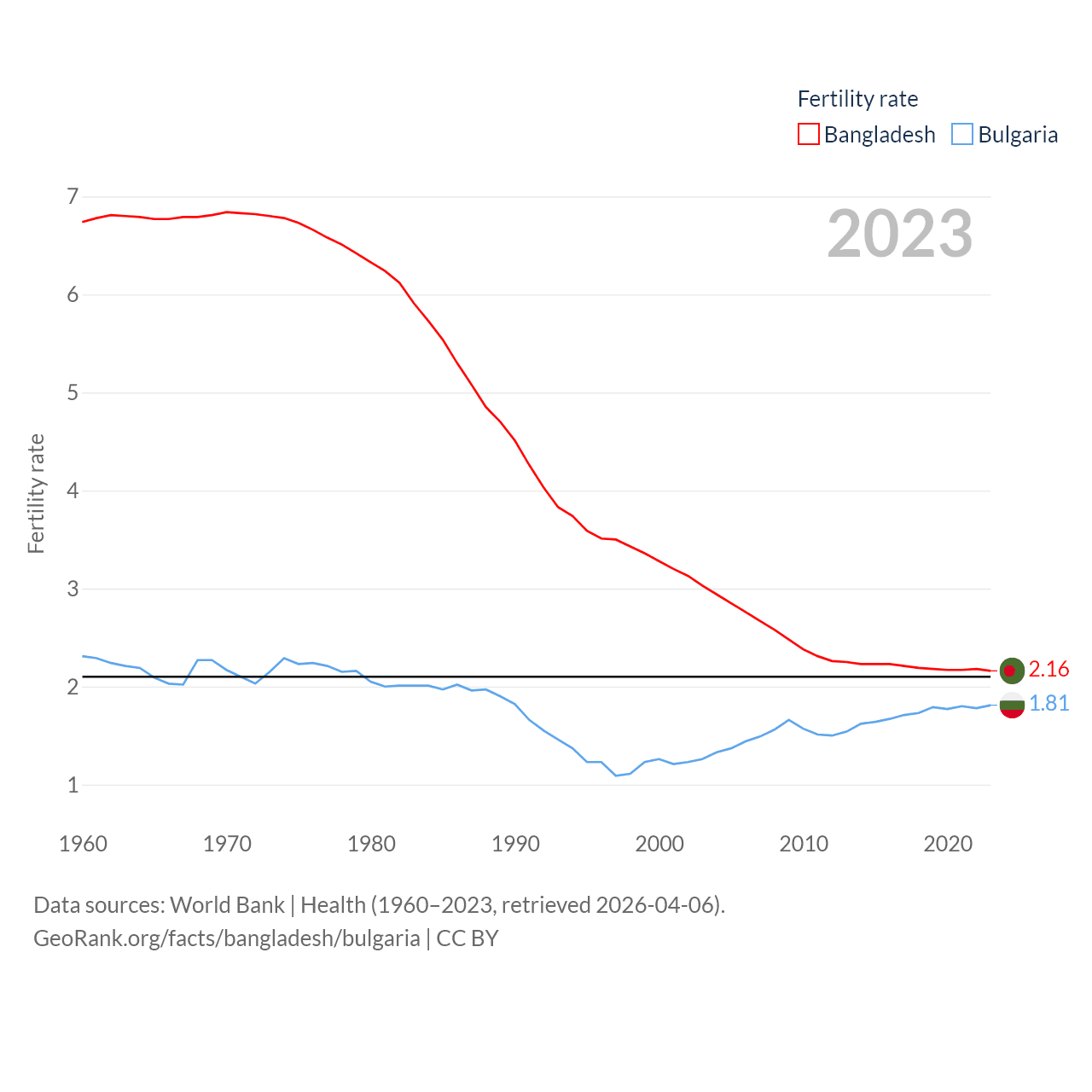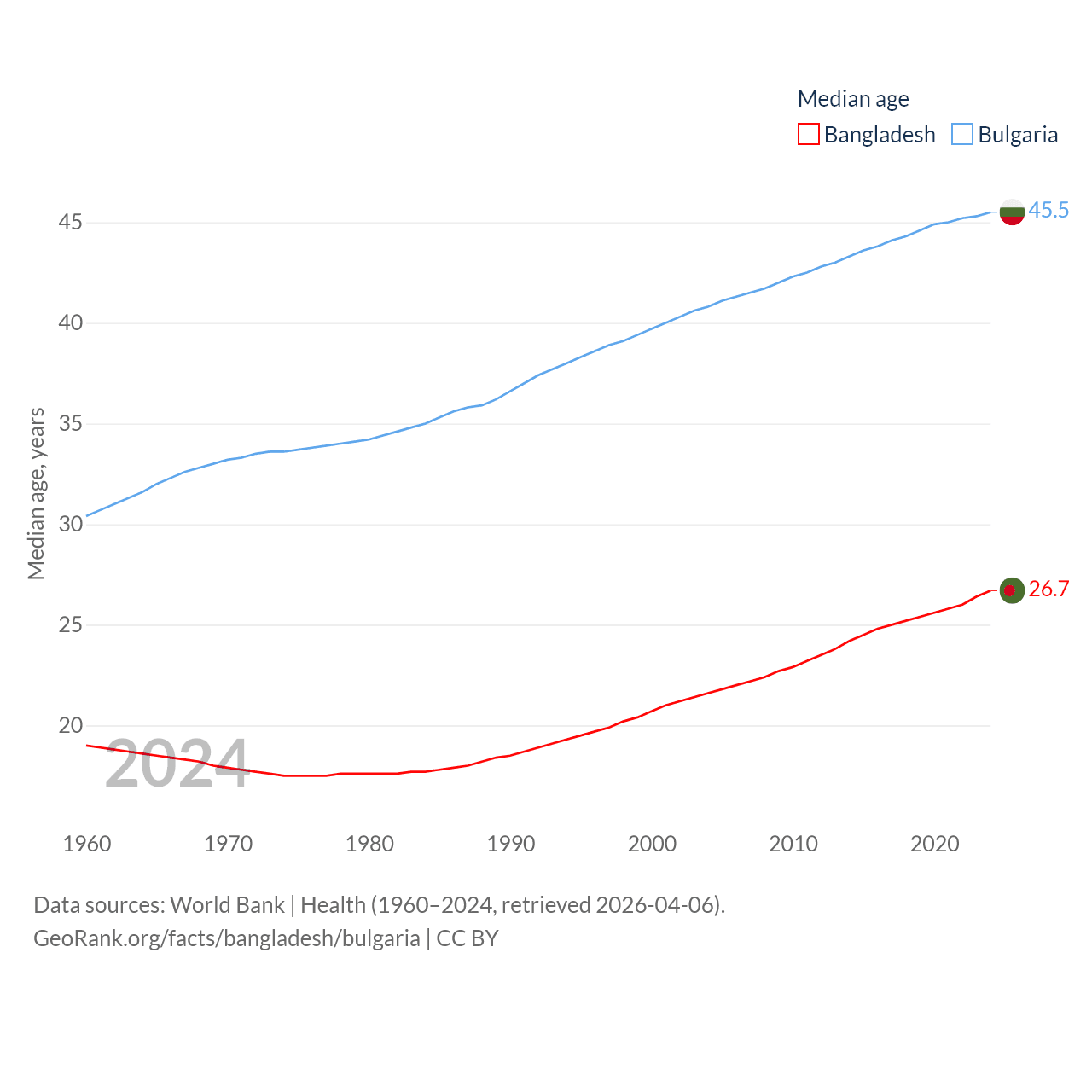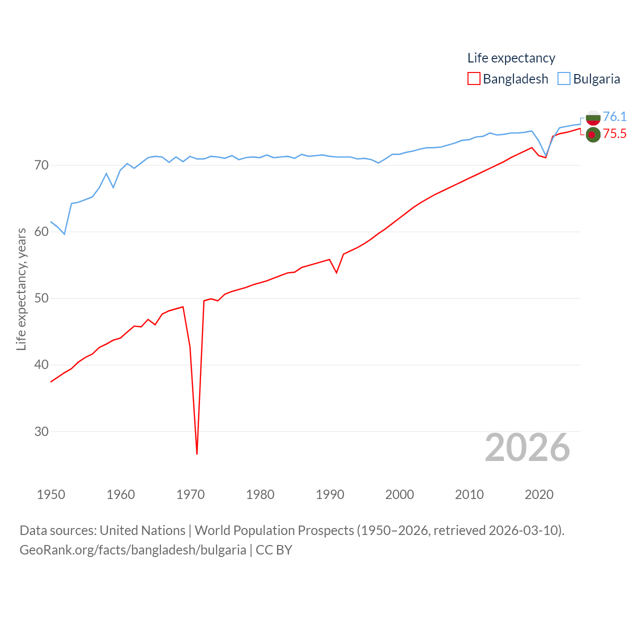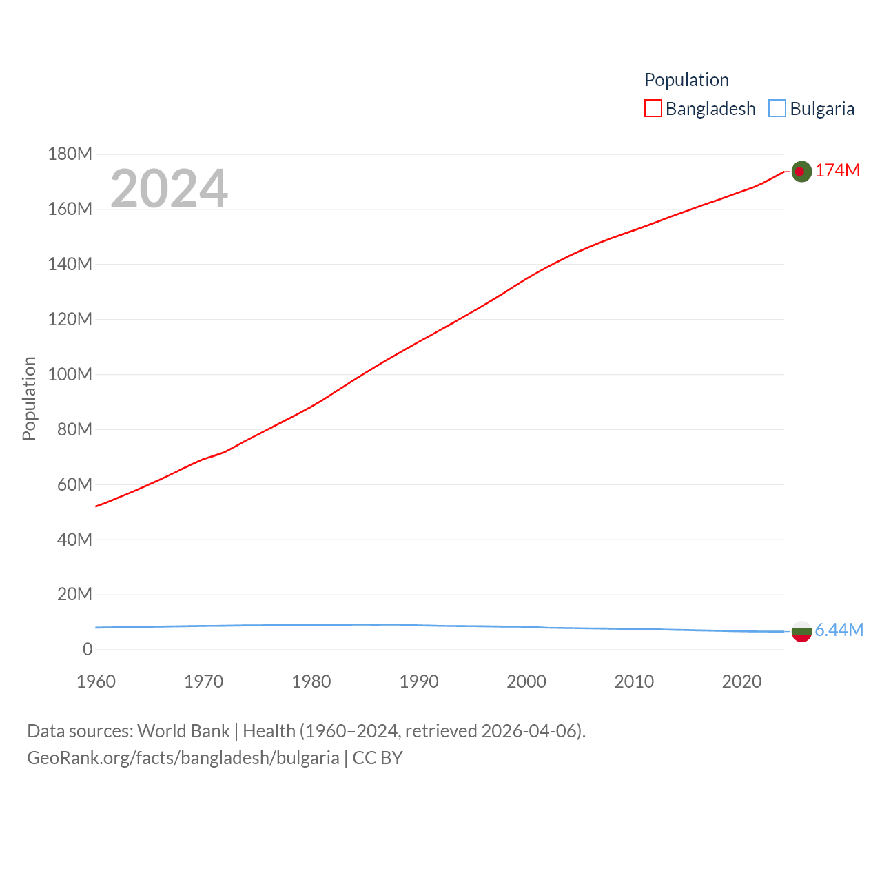 Bangladesh has a population of 174M (ranked 8/197), compared with 6.44M in Bulgaria (ranked 110/197). Bangladesh's land area is 50,186 sq mi versus 41,915 sq mi for Bulgaria (ranked 94th vs. 101st).