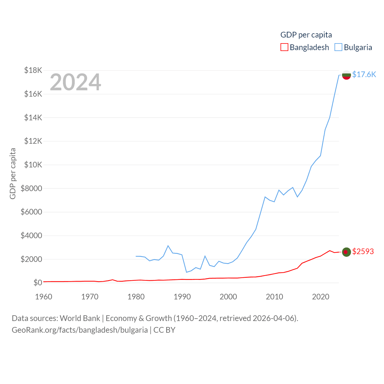 By GDP, Bangladesh ranks 36/197 ($450B) and Bulgaria ranks 67/197 ($113B). By GDP per capita, Bangladesh ranks 146/197 ($2,593), while Bulgaria ranks 64/197 ($17,596).