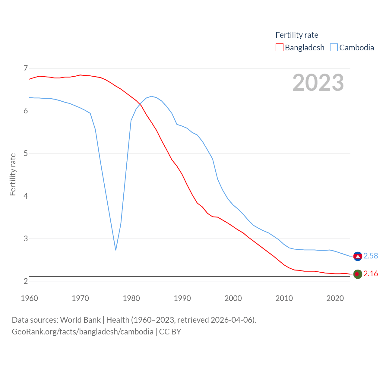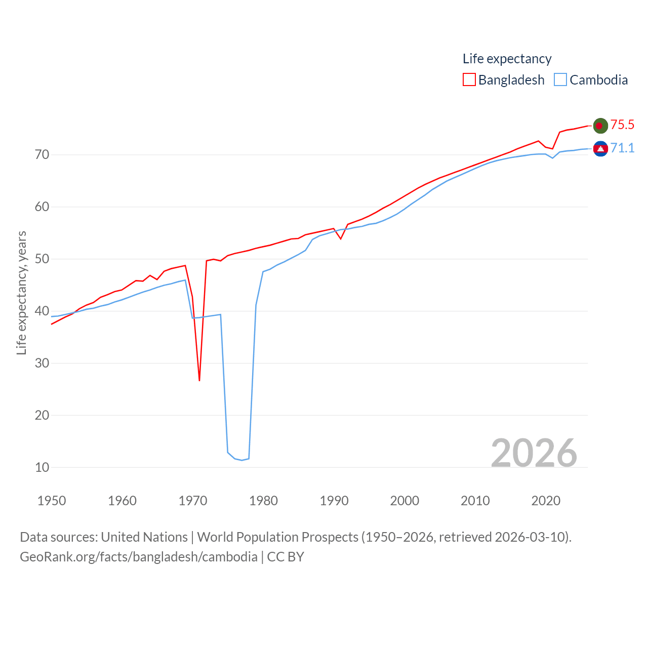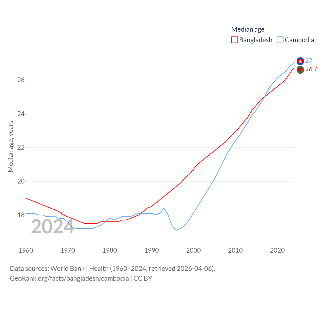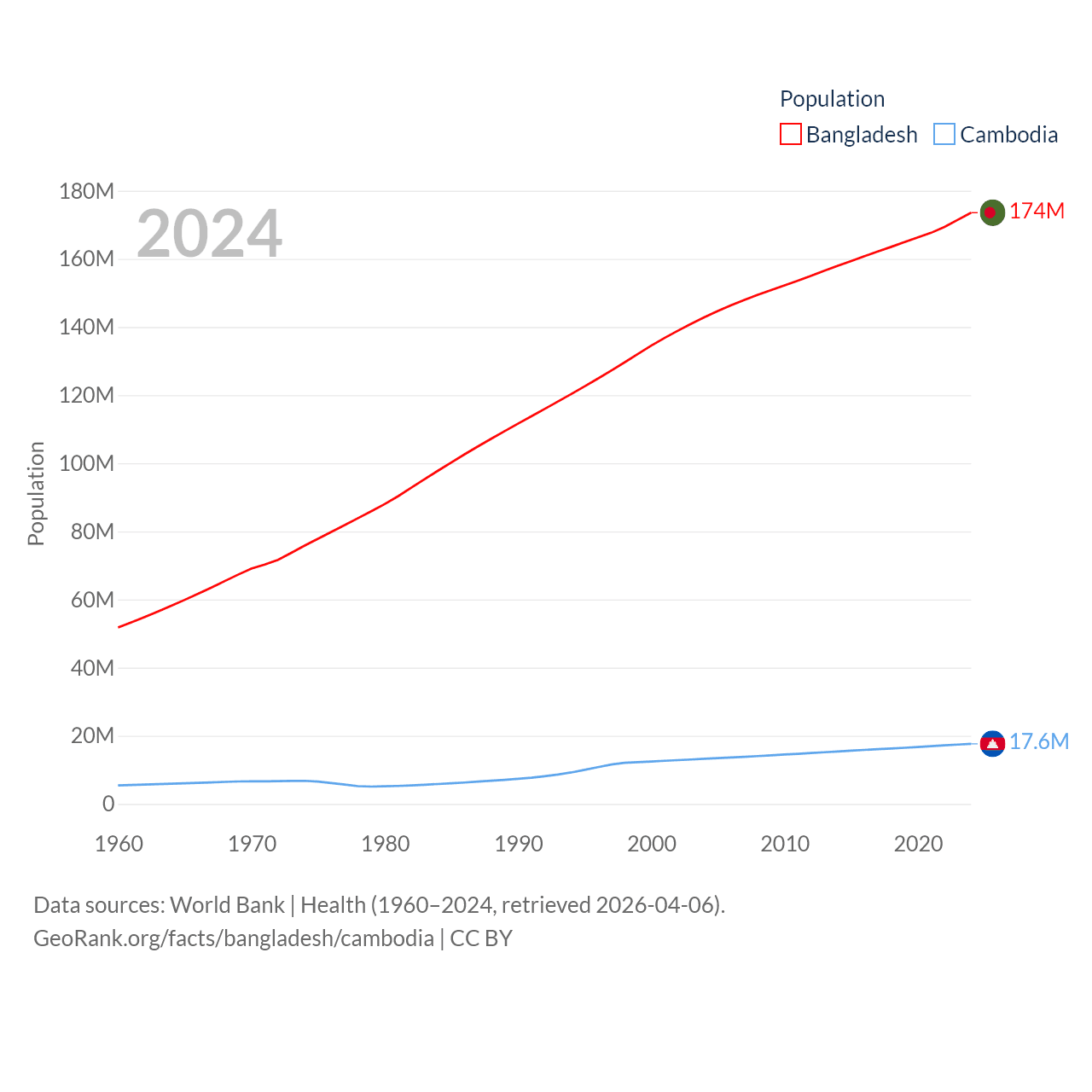 Bangladesh has a population of 174M (ranked 8/197), compared with 17.6M in Cambodia (ranked 73/197). Bangladesh's land area is 50,186 sq mi versus 68,155 sq mi for Cambodia (ranked 94th vs. 88th).