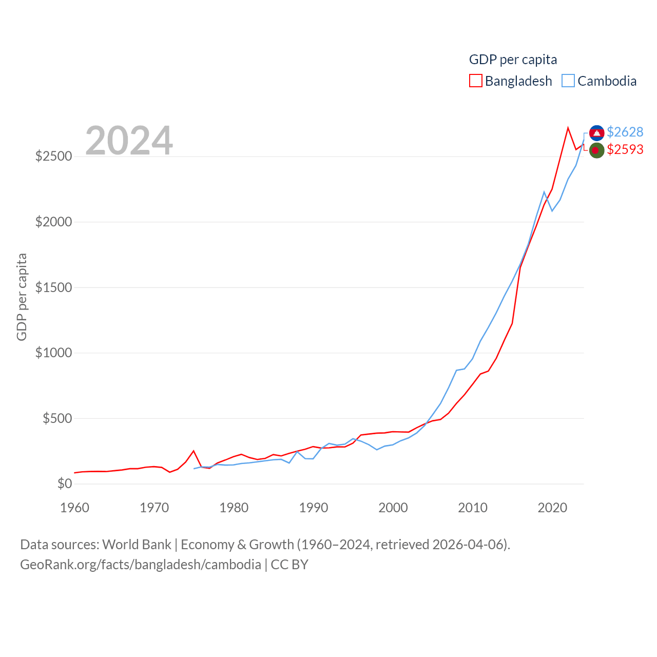 By GDP, Bangladesh ranks 36/197 ($450B) and Cambodia ranks 97/197 ($46.4B). By GDP per capita, Bangladesh ranks 146/197 ($2,593), while Cambodia ranks 145/197 ($2,628).