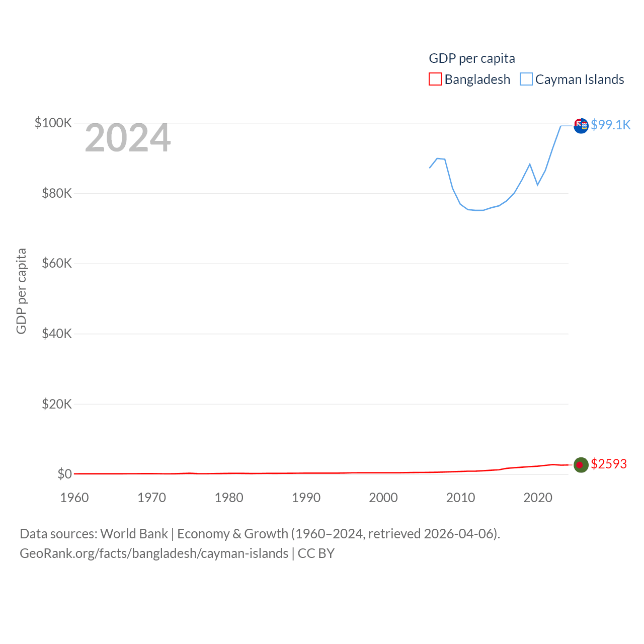 By GDP, Bangladesh ranks 36/197 ($450B) and The Cayman Islands ranks 158/197 ($7.24B). By GDP per capita, Bangladesh ranks 146/197 ($2,593), while The Cayman Islands ranks 6/197 ($99,144).