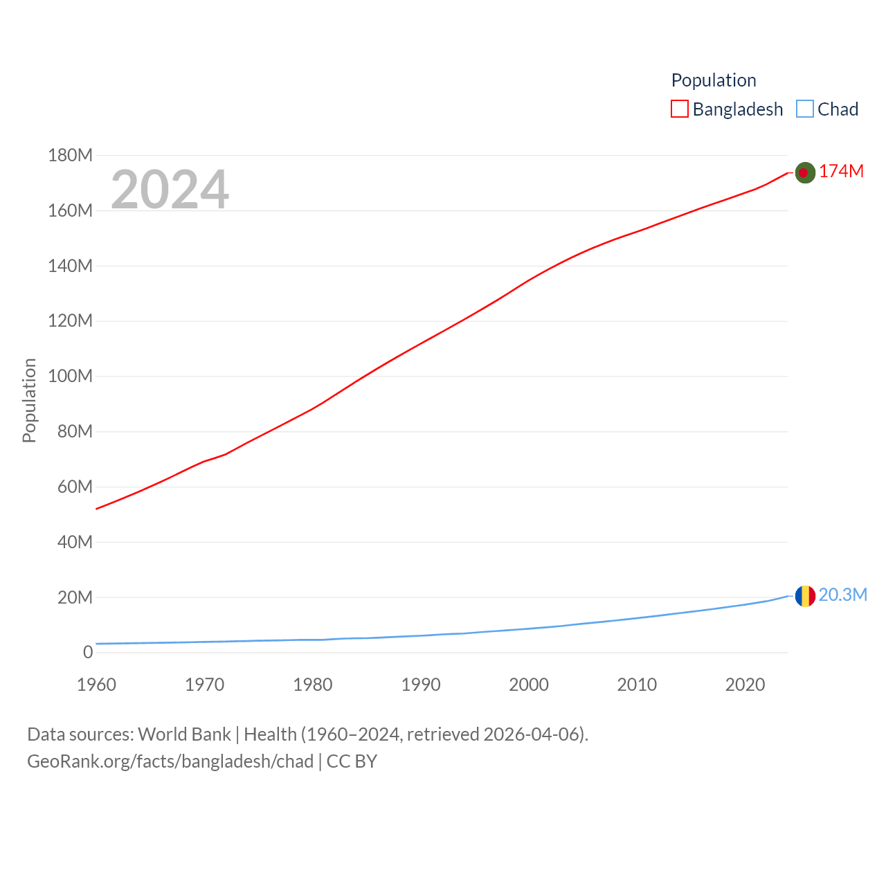 Bangladesh has a population of 174M (ranked 8/197), compared with 20.3M in Chad (ranked 65/197). Bangladesh's land area is 50,186 sq mi versus 486,180 sq mi for Chad (ranked 94th vs. 21st).