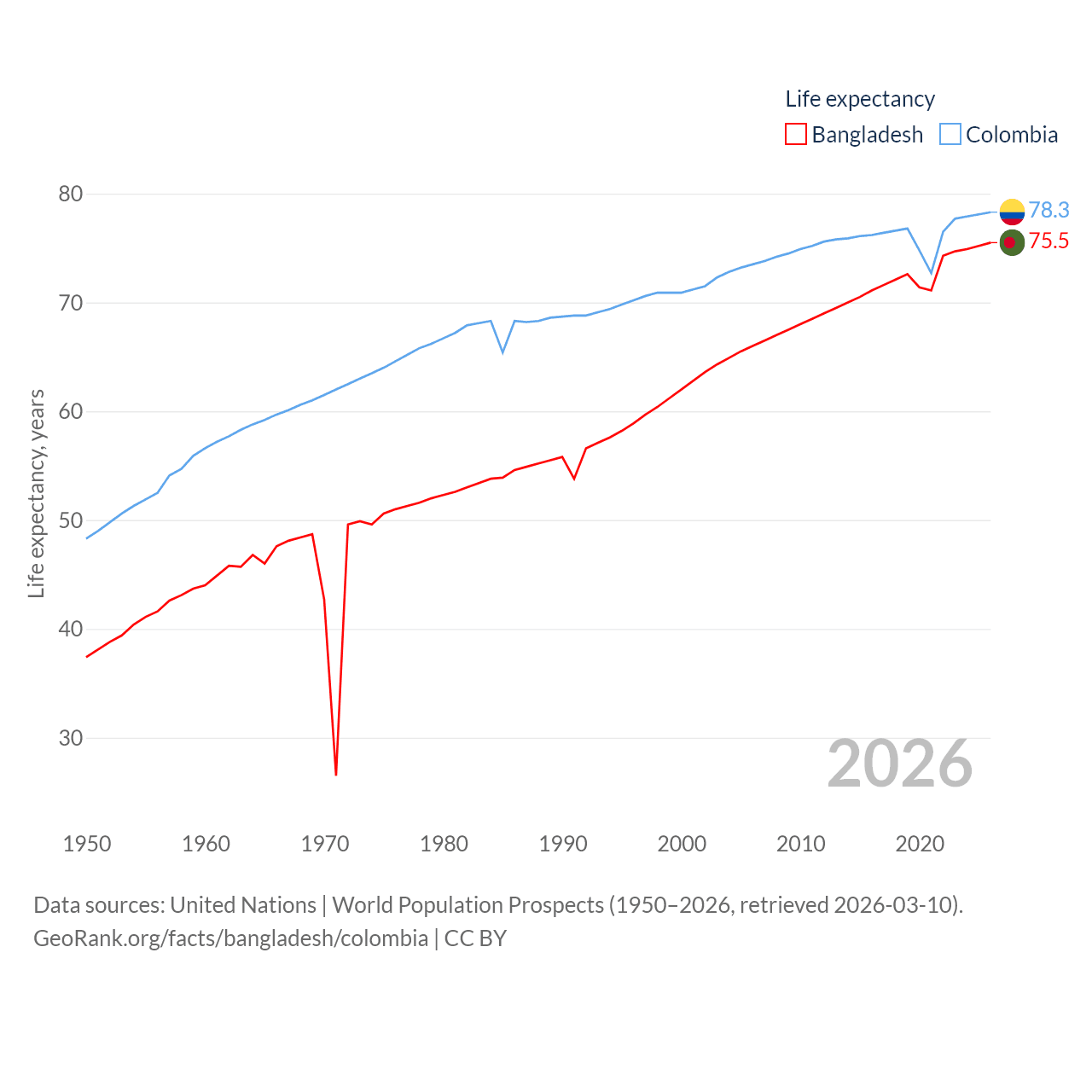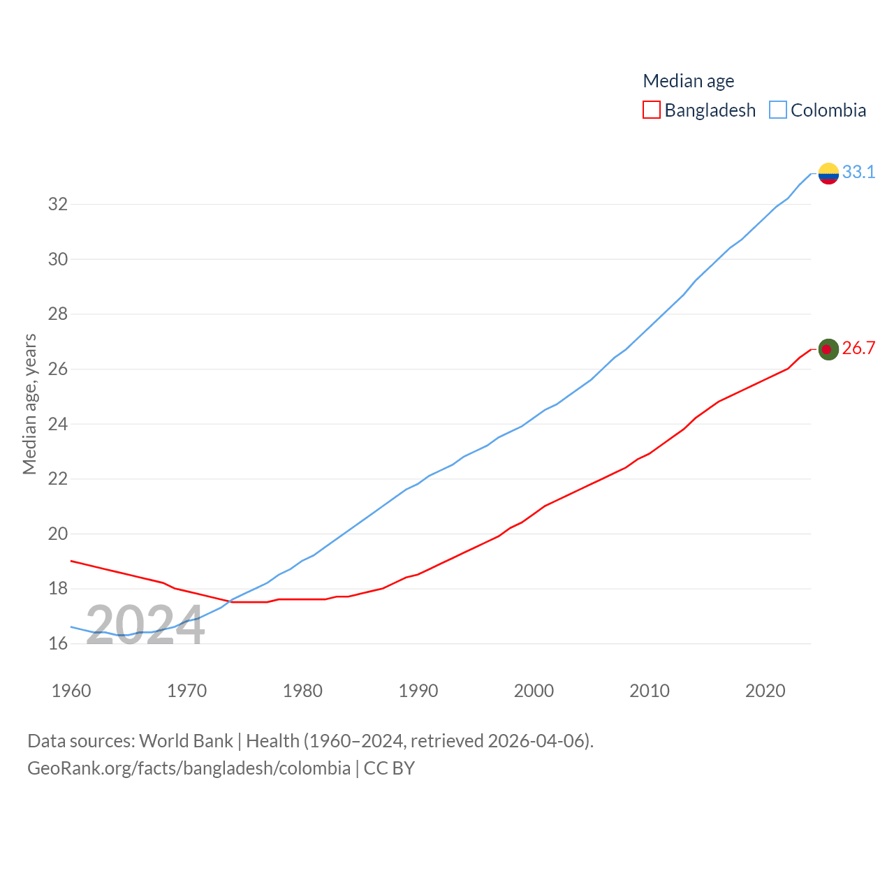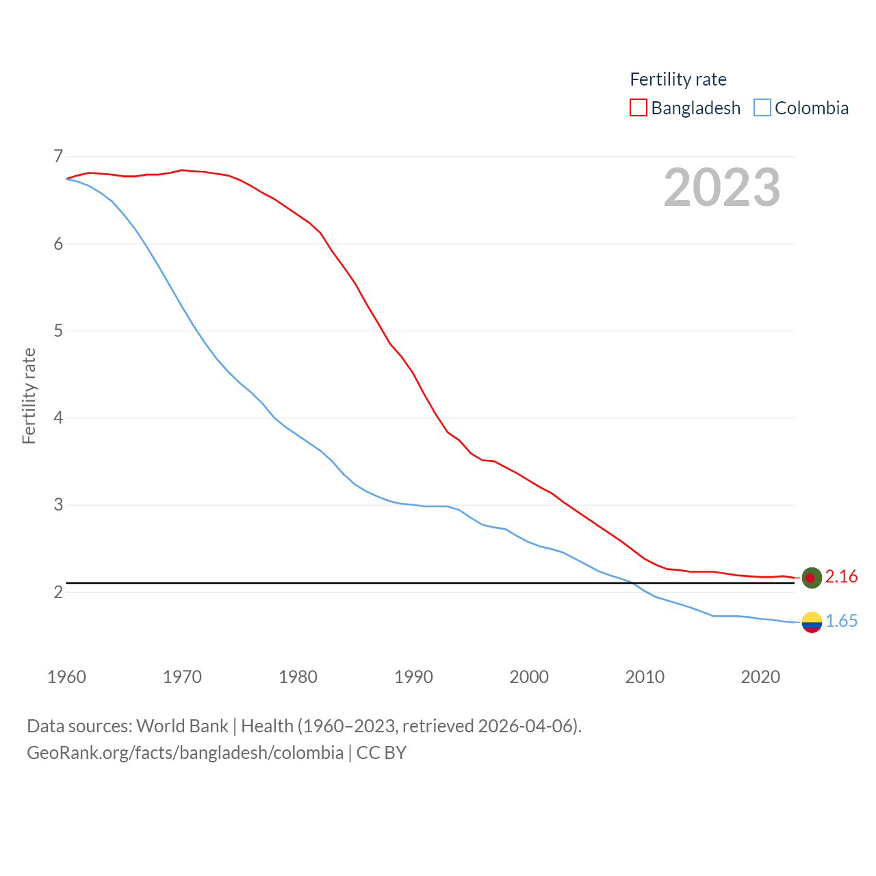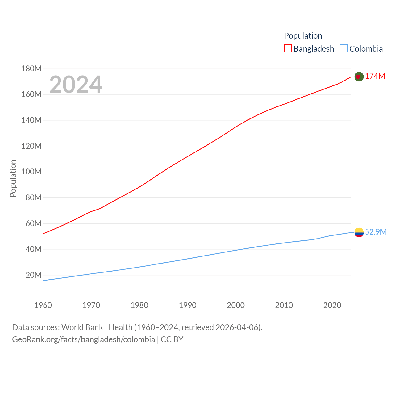Bangladesh has a population of 174M (ranked 8/197), compared with 52.9M in Colombia (ranked 28/197). Bangladesh's land area is 50,186 sq mi versus 428,380 sq mi for Colombia (ranked 94th vs. 26th).