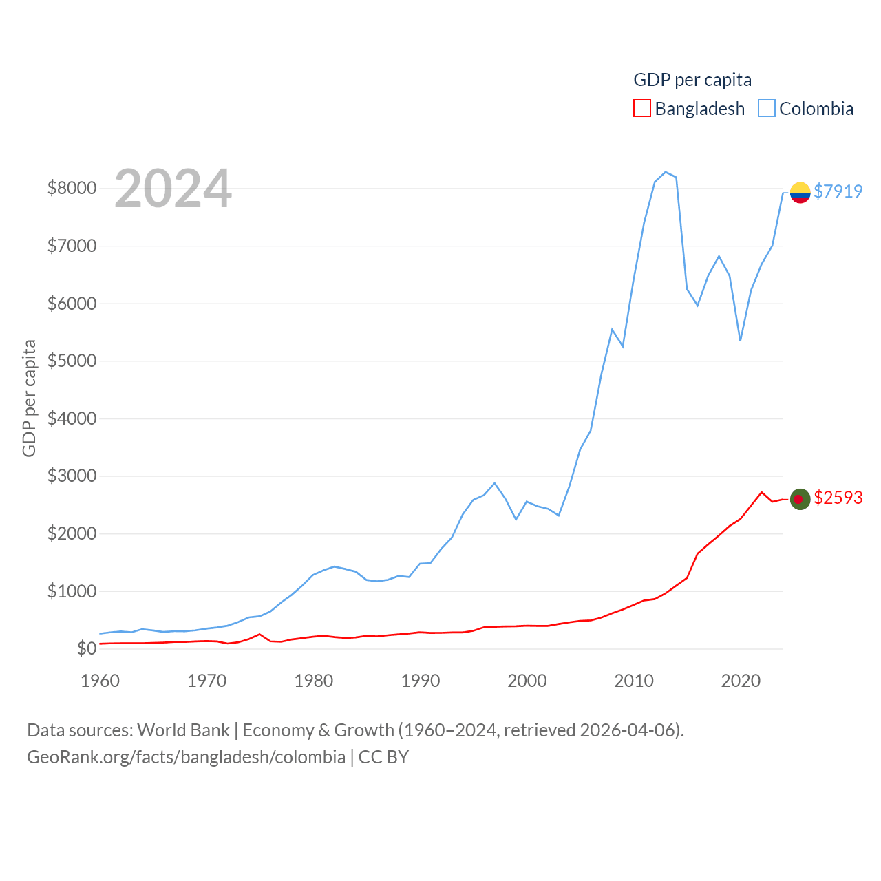 By GDP, Bangladesh ranks 36/197 ($450B) and Colombia ranks 39/197 ($419B). By GDP per capita, Bangladesh ranks 146/197 ($2,593), while Colombia ranks 94/197 ($7,919).