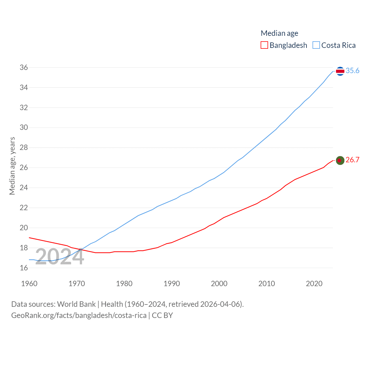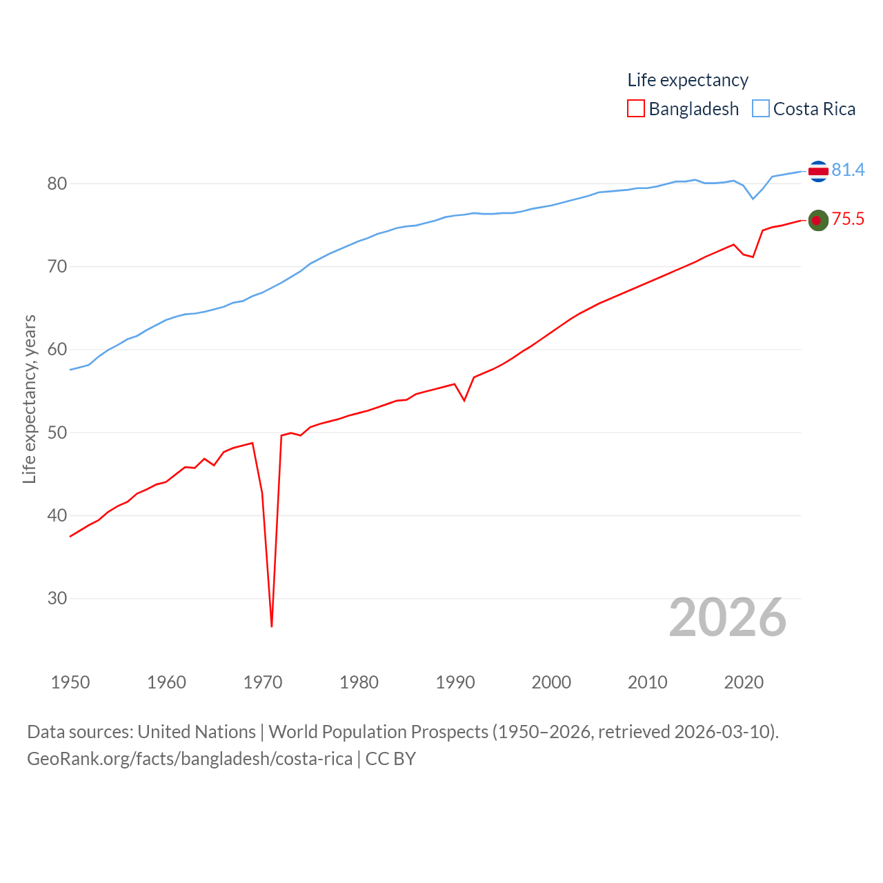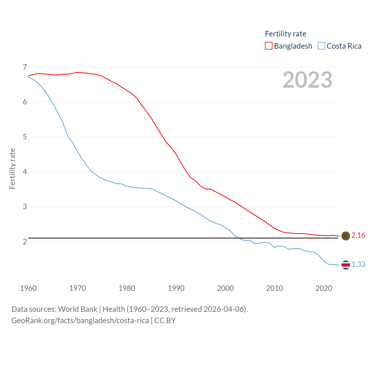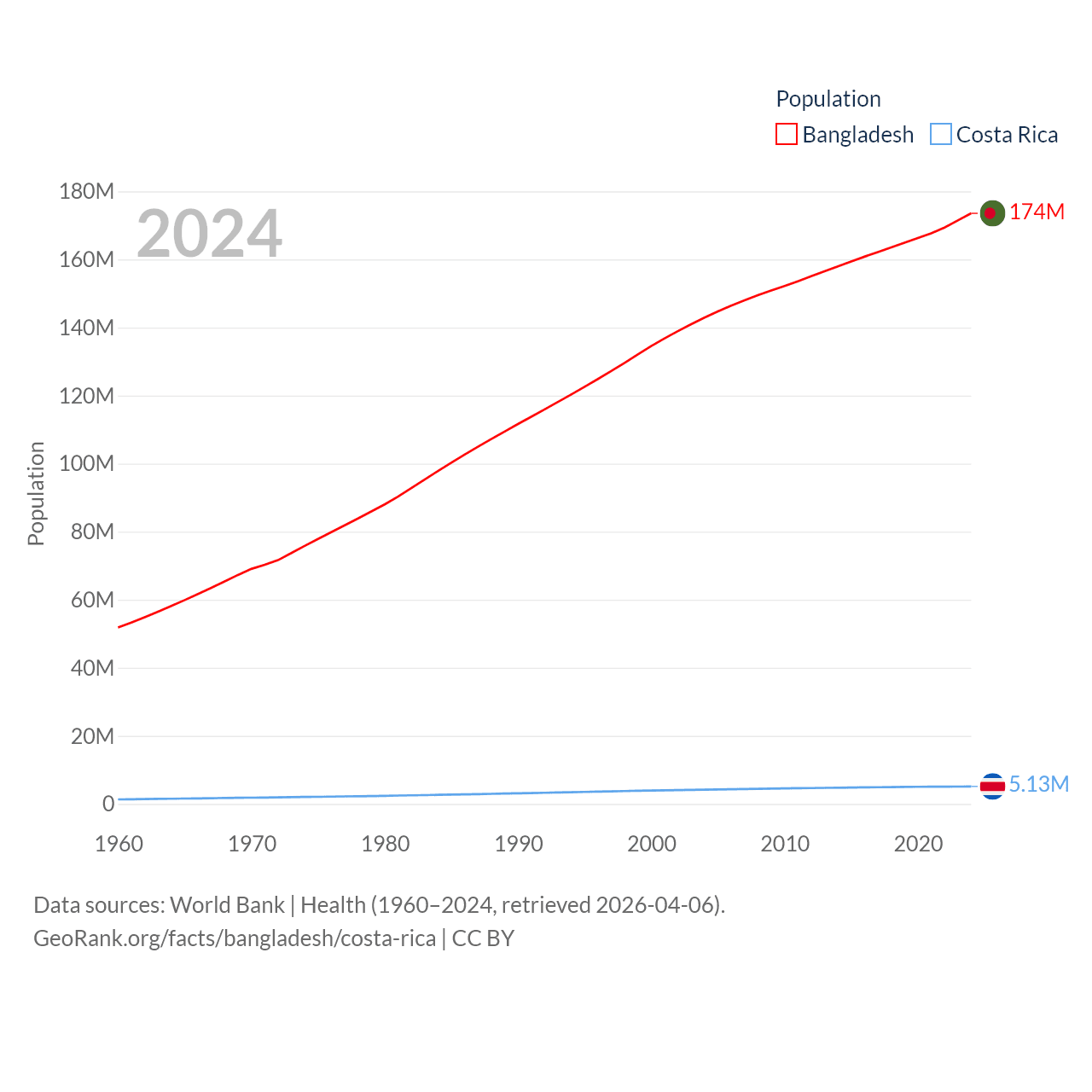 Bangladesh has a population of 174M (ranked 8/197), compared with 5.13M in Costa Rica (ranked 126/197). Bangladesh's land area is 50,186 sq mi versus 19,714 sq mi for Costa Rica (ranked 94th vs. 126th).