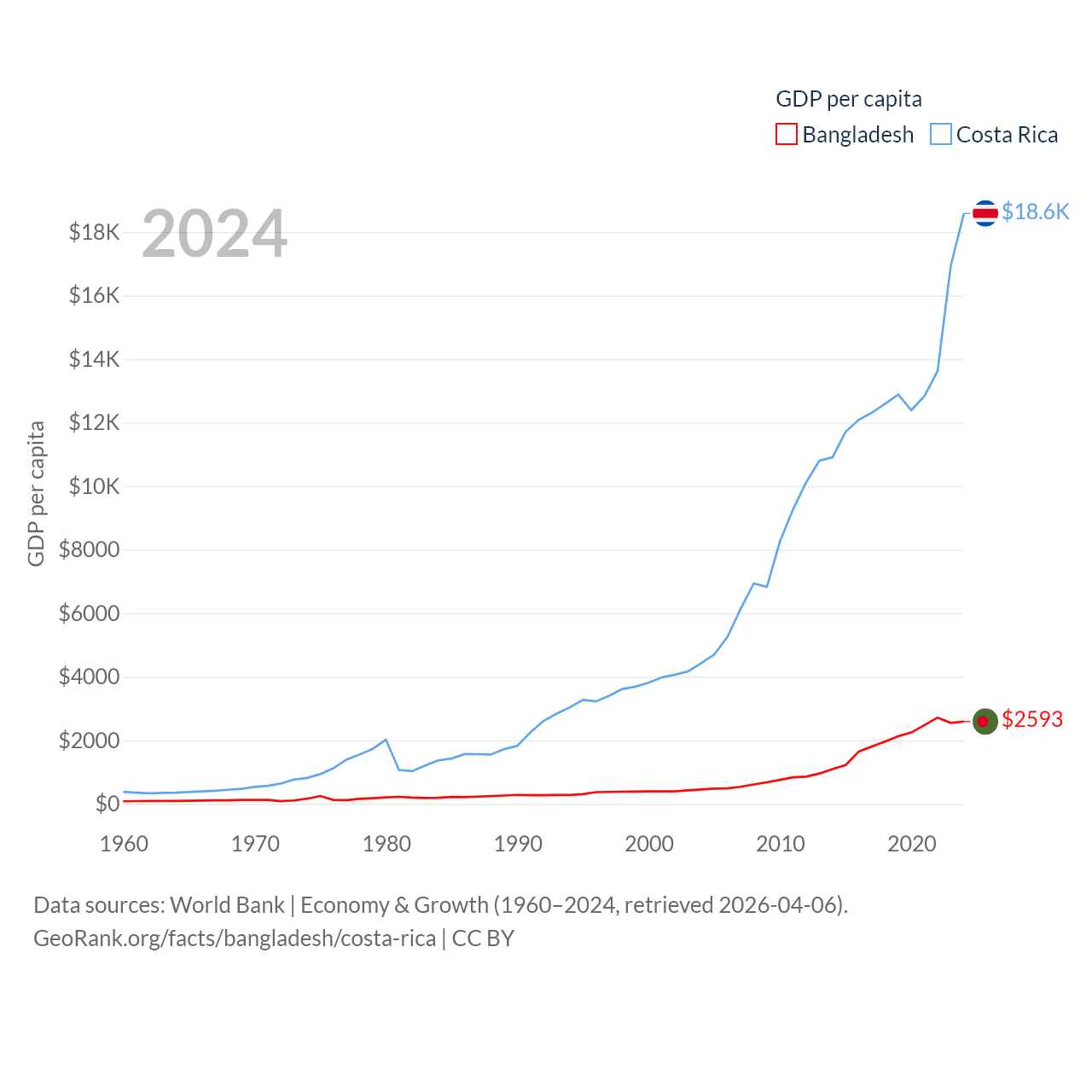 By GDP, Bangladesh ranks 36/197 ($450B) and Costa Rica ranks 73/197 ($95.4B). By GDP per capita, Bangladesh ranks 146/197 ($2,593), while Costa Rica ranks 62/197 ($18,587).