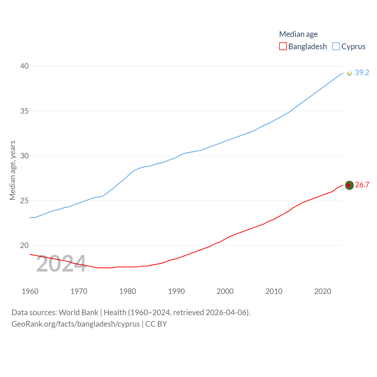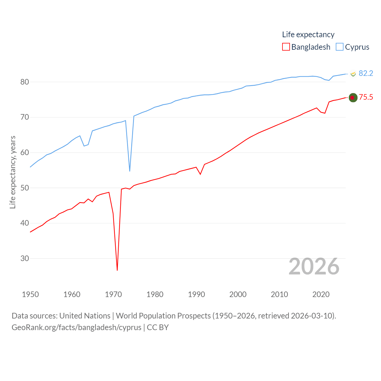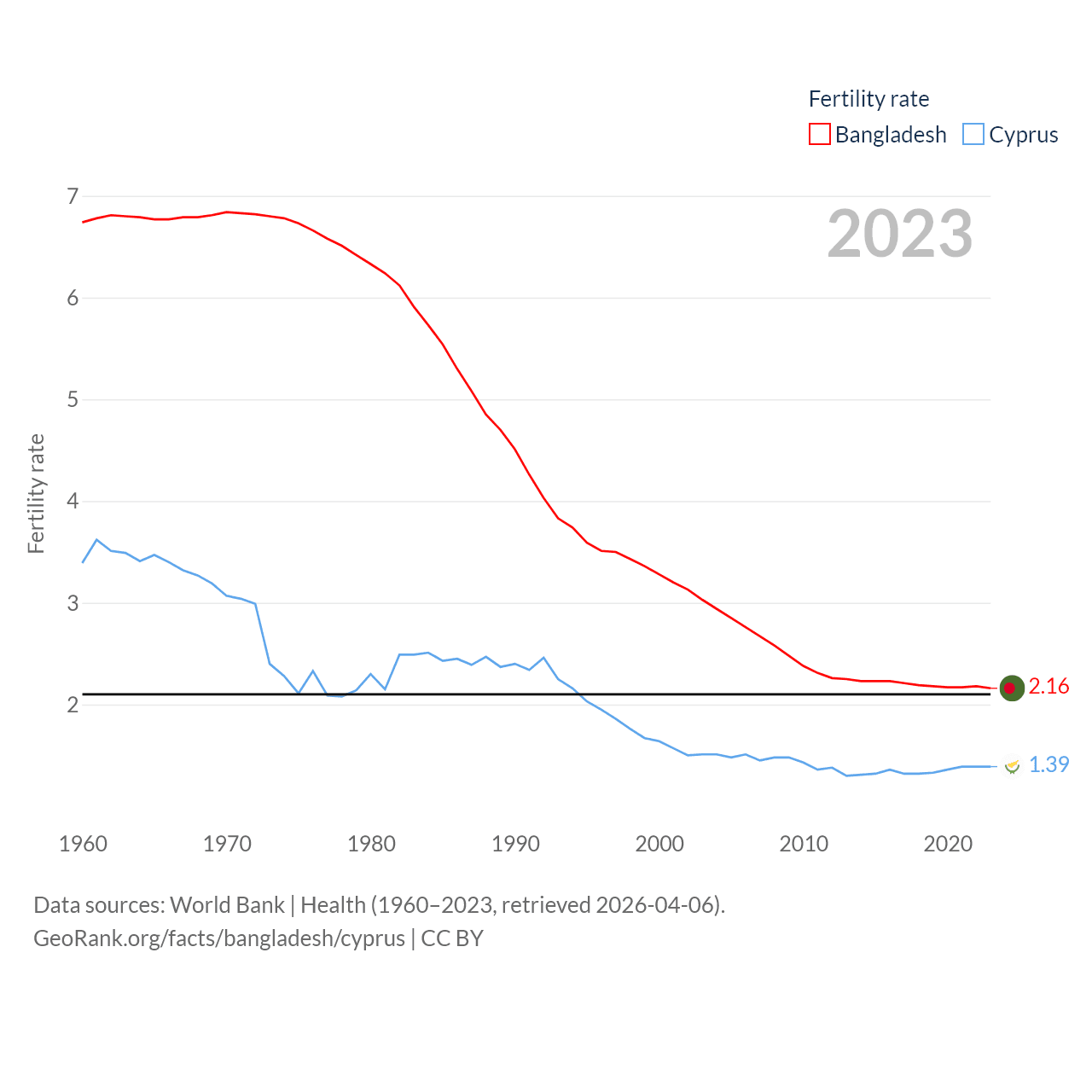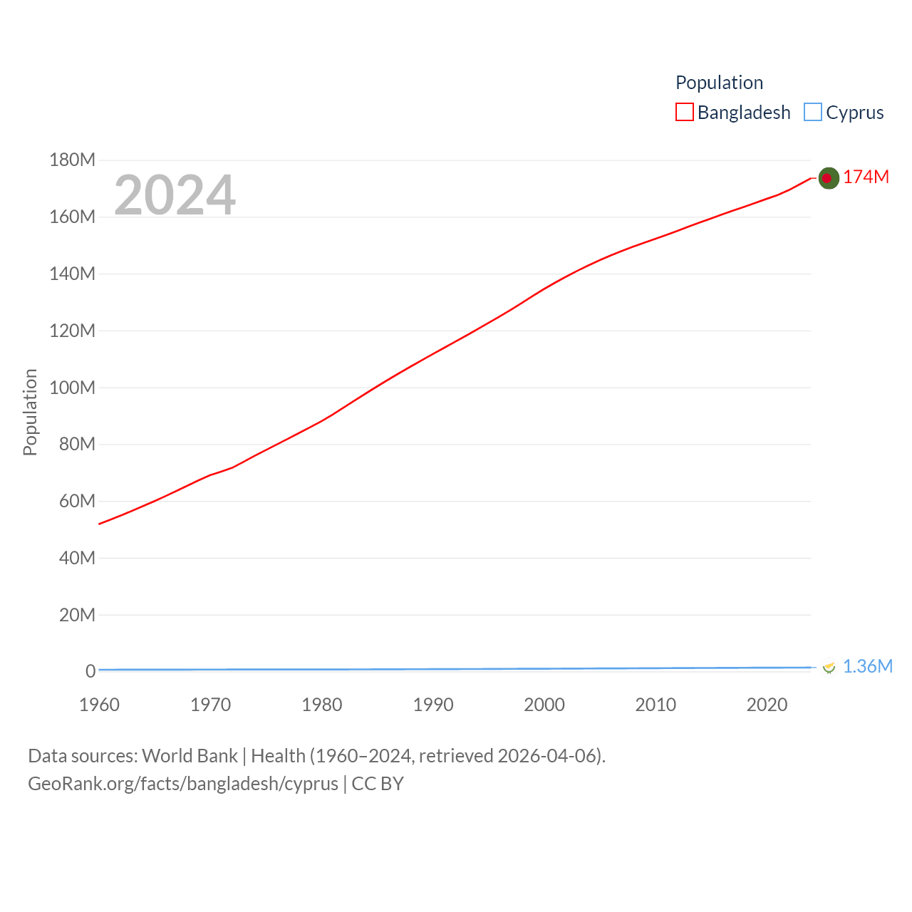 Bangladesh has a population of 174M (ranked 8/197), compared with 1.36M in Cyprus (ranked 155/197). Bangladesh's land area is 50,186 sq mi versus 3,568 sq mi for Cyprus (ranked 94th vs. 163rd).
