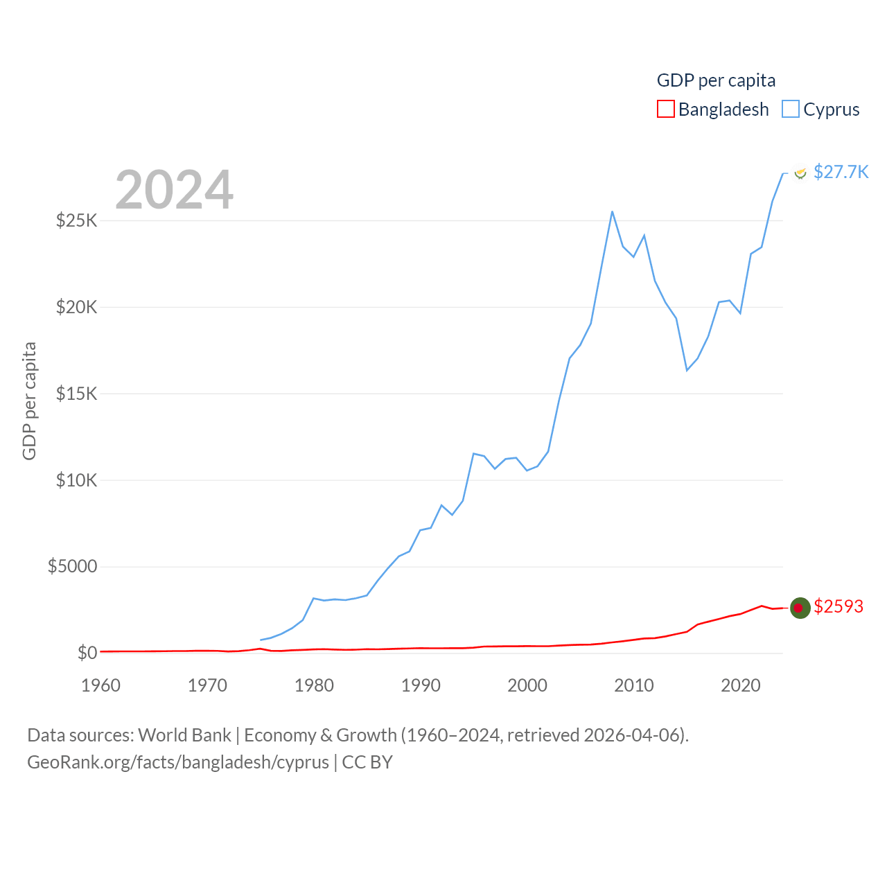 By GDP, Bangladesh ranks 36/197 ($450B) and Cyprus ranks 103/197 ($37.6B). By GDP per capita, Bangladesh ranks 146/197 ($2,593), while Cyprus ranks 45/197 ($27,707).