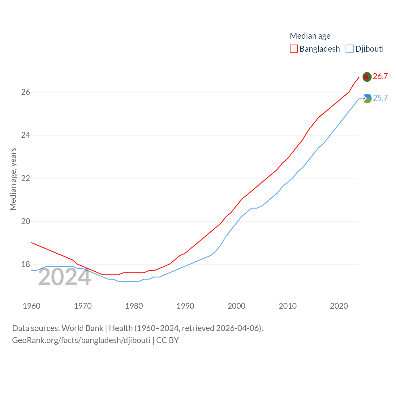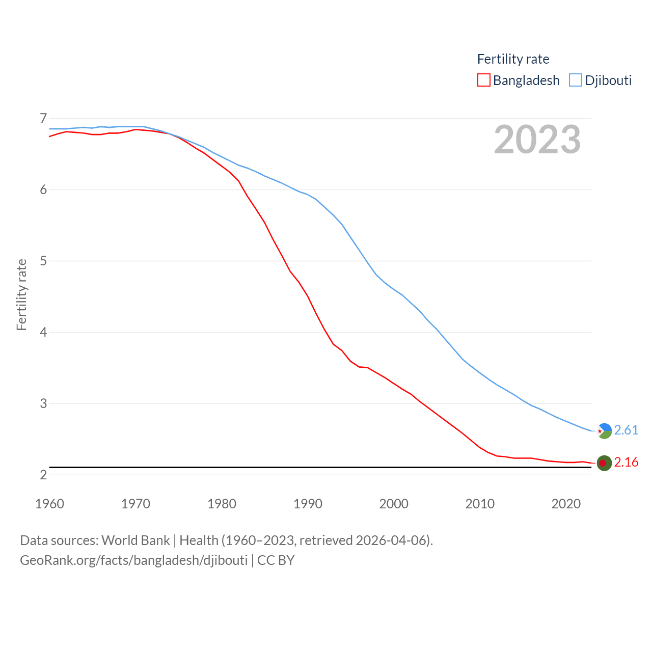 Bangladesh has a population of 174M (ranked 8/197), compared with 1.17M in Djibouti (ranked 158/197). Bangladesh's land area is 50,186 sq mi versus 8,950 sq mi for Djibouti (ranked 94th vs. 147th).
