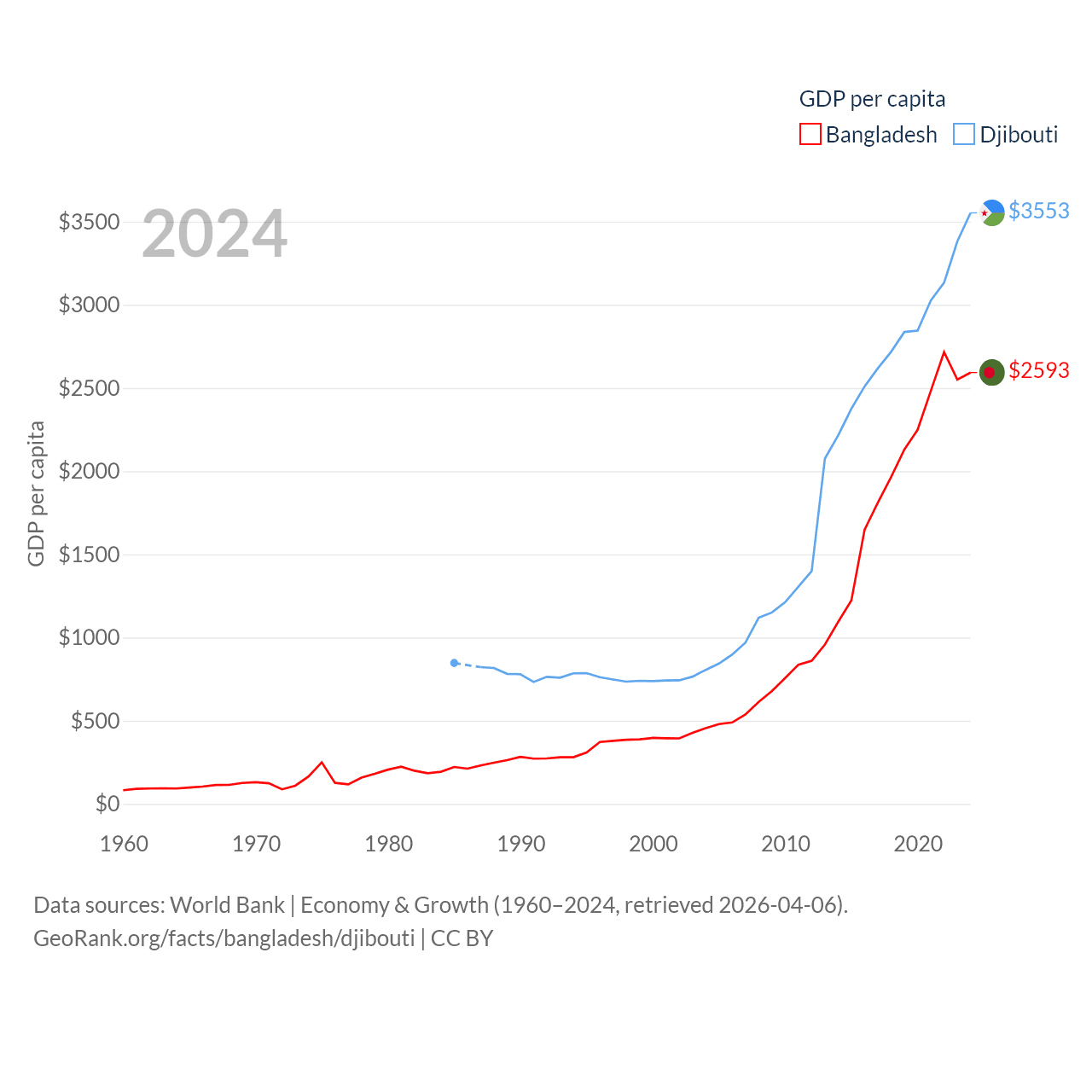 By GDP, Bangladesh ranks 36/197 ($450B) and Djibouti ranks 165/197 ($4.15B). By GDP per capita, Bangladesh ranks 146/197 ($2,593), while Djibouti ranks 133/197 ($3,553).