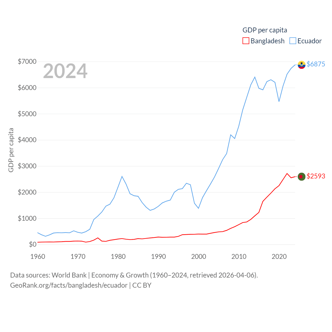 By GDP, Bangladesh ranks 36/197 ($450B) and Ecuador ranks 62/197 ($125B). By GDP per capita, Bangladesh ranks 146/197 ($2,593), while Ecuador ranks 103/197 ($6,875).