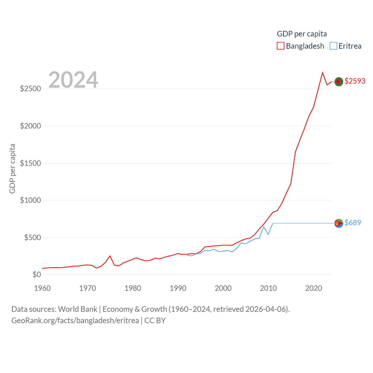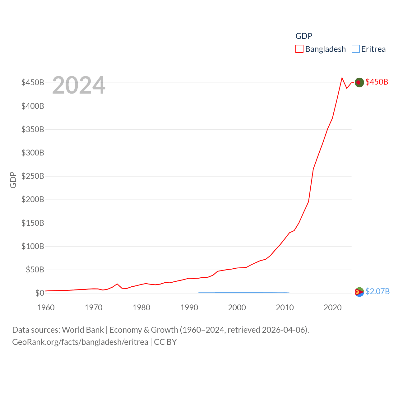 By GDP, Bangladesh ranks 36/197 ($450B) and Eritrea ranks 179/197 ($2.07B). By GDP per capita, Bangladesh ranks 146/197 ($2,593), while Eritrea ranks 188/197 ($689).