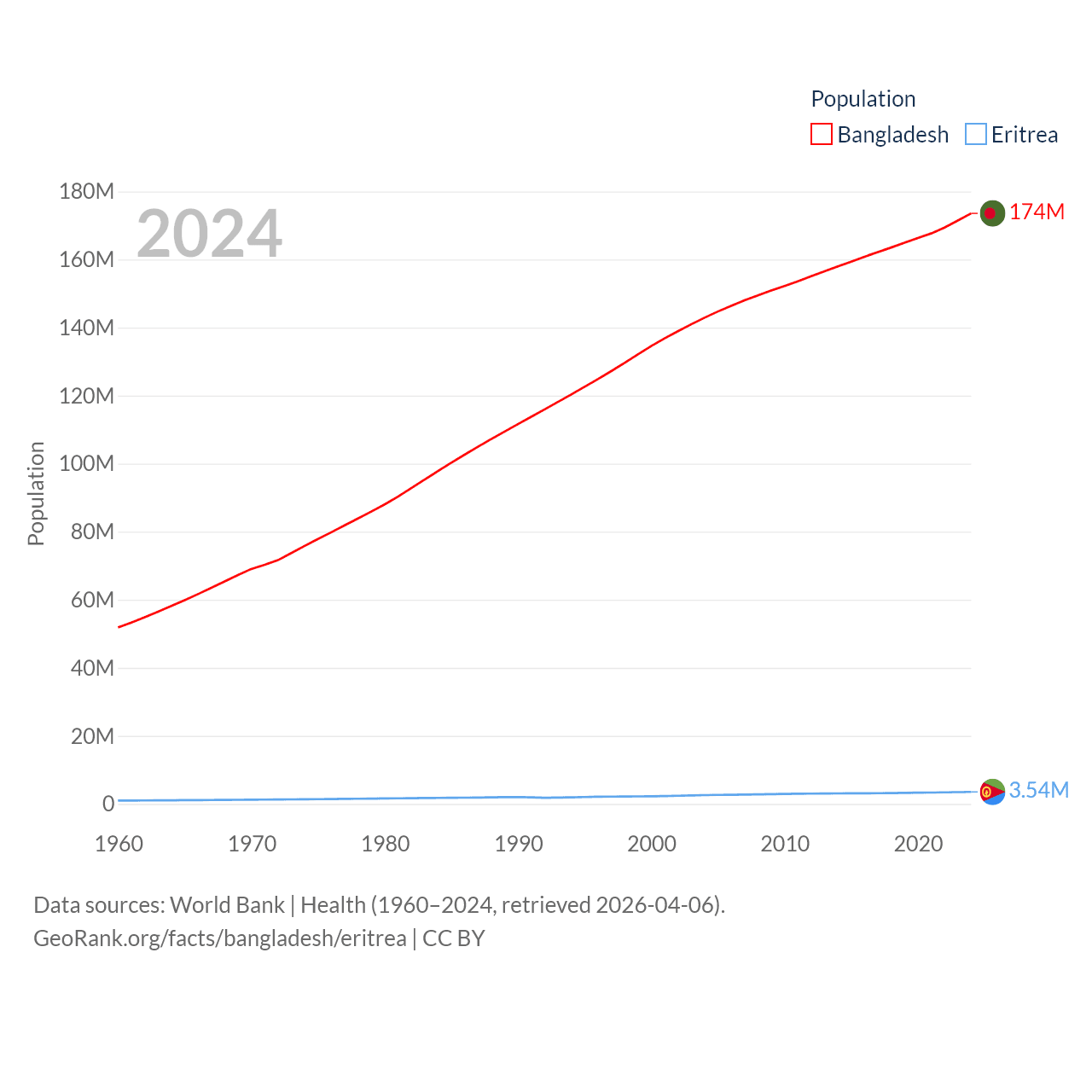 Bangladesh has a population of 174M (ranked 8/197), compared with 3.54M in Eritrea (ranked 131/197). Bangladesh's land area is 50,186 sq mi versus 46,787 sq mi for Eritrea (ranked 94th vs. 96th).