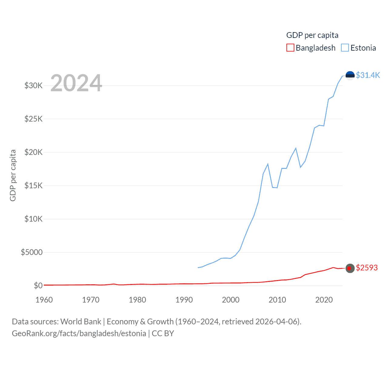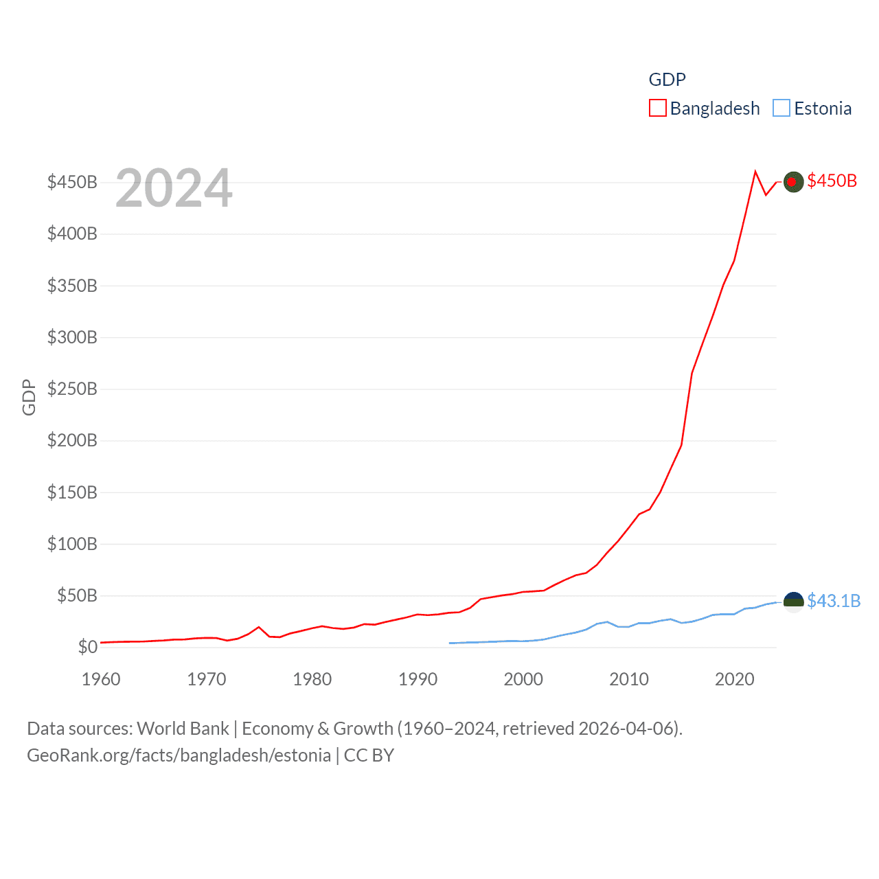 By GDP, Bangladesh ranks 36/197 ($450B) and Estonia ranks 100/197 ($43.1B). By GDP per capita, Bangladesh ranks 146/197 ($2,593), while Estonia ranks 40/197 ($31,428).