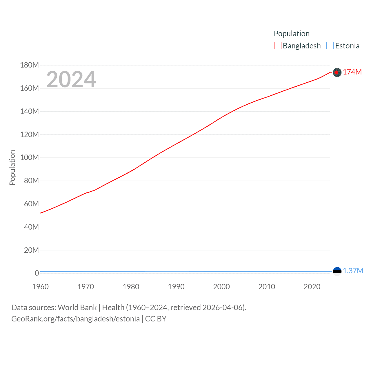 Bangladesh has a population of 174M (ranked 8/197), compared with 1.37M in Estonia (ranked 153/197). Bangladesh's land area is 50,186 sq mi versus 16,498 sq mi for Estonia (ranked 94th vs. 129th).