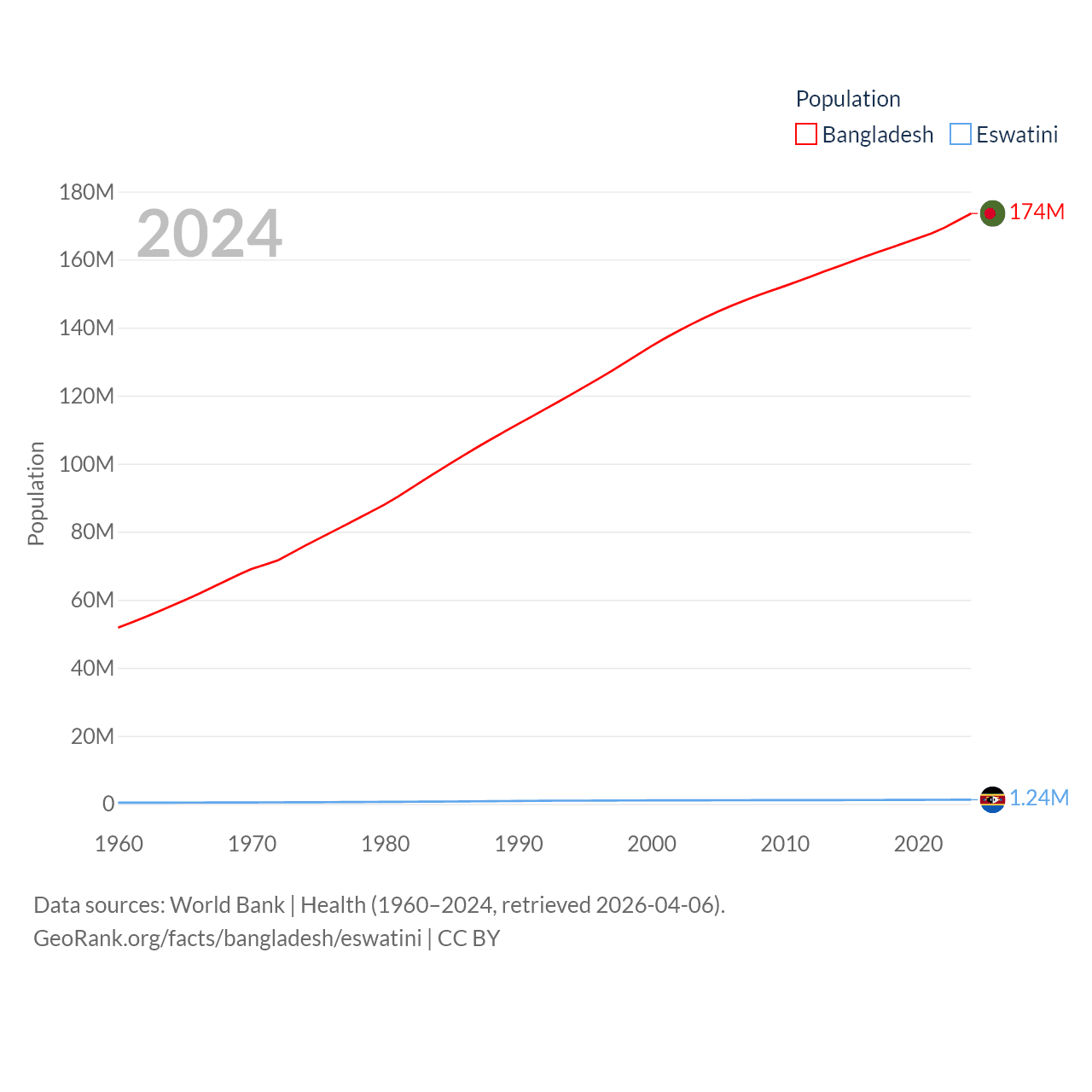 Bangladesh has a population of 174M (ranked 8/197), compared with 1.24M in Eswatini (ranked 157/197). Bangladesh's land area is 50,186 sq mi versus 6,641 sq mi for Eswatini (ranked 94th vs. 154th).