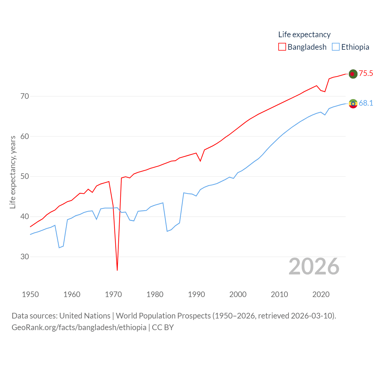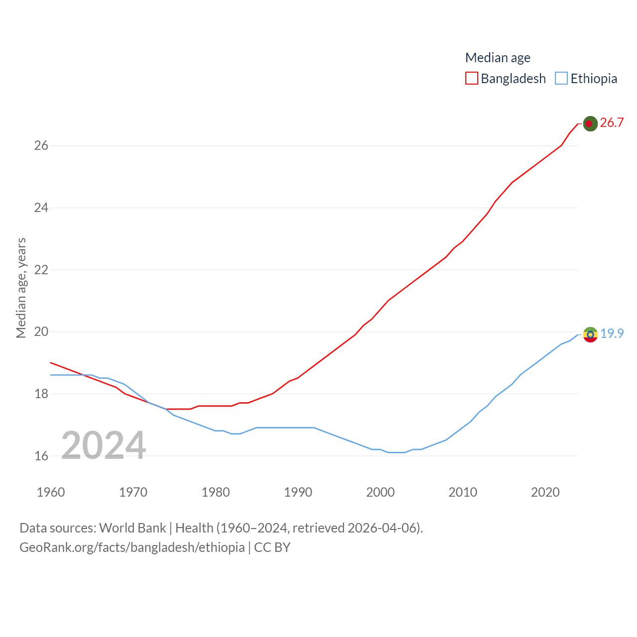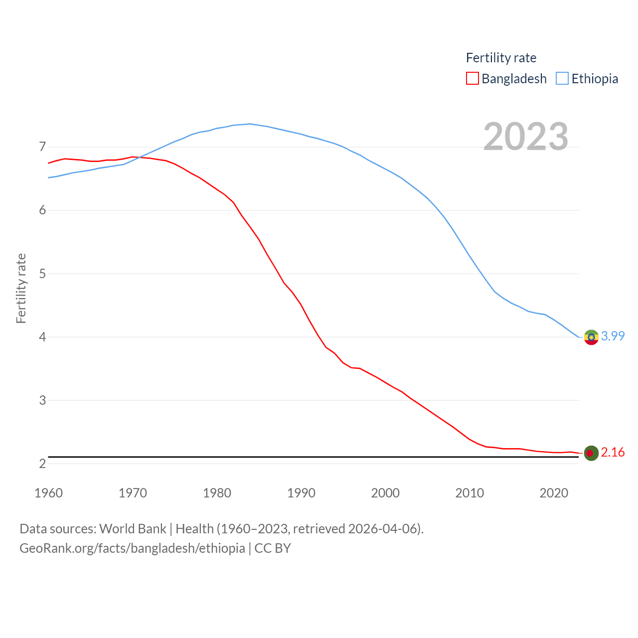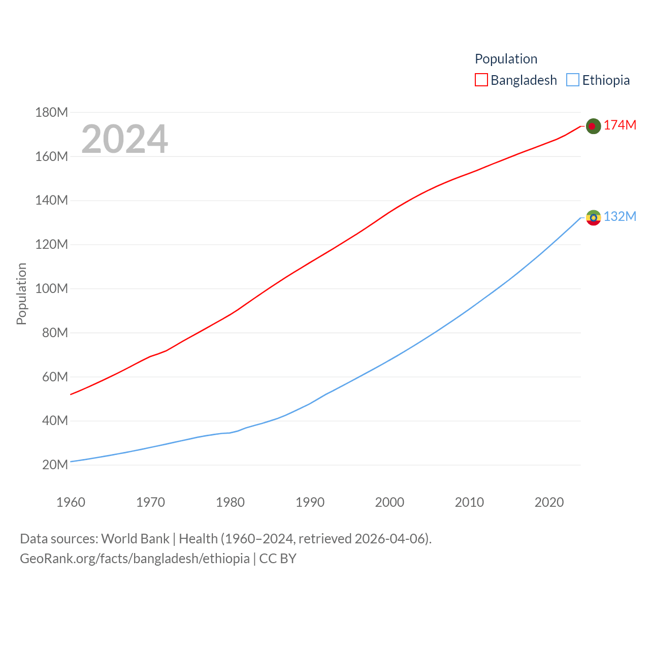 Bangladesh has a population of 174M (ranked 8/197), compared with 132M in Ethiopia (ranked 10/197). Bangladesh's land area is 50,186 sq mi versus 435,716 sq mi for Ethiopia (ranked 94th vs. 25th).