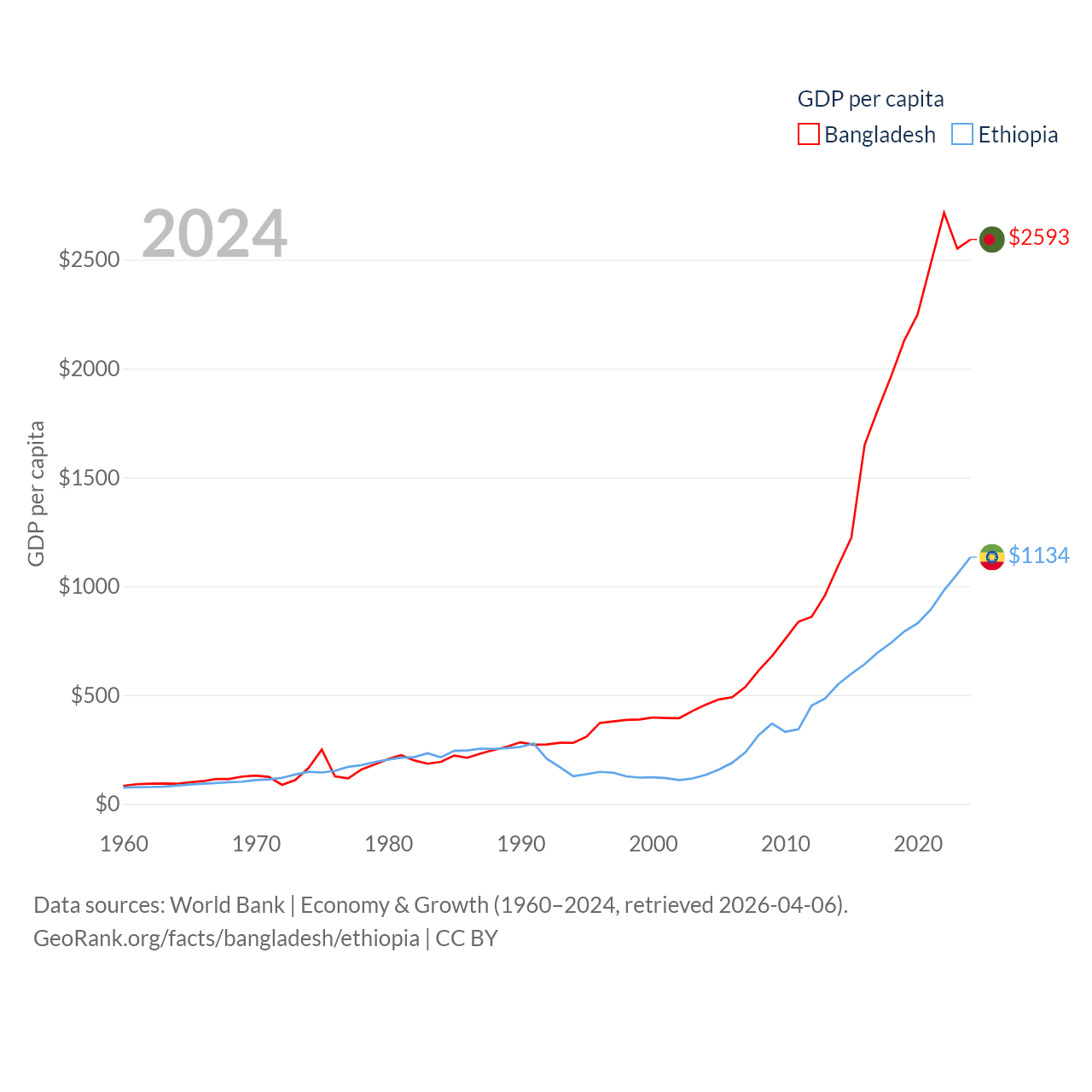 By GDP, Bangladesh ranks 36/197 ($450B) and Ethiopia ranks 60/197 ($150B). By GDP per capita, Bangladesh ranks 146/197 ($2,593), while Ethiopia ranks 171/197 ($1,134).